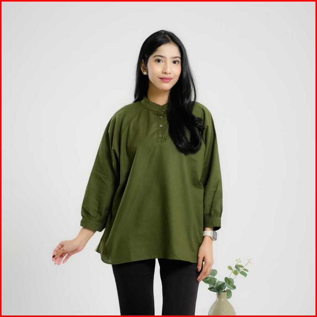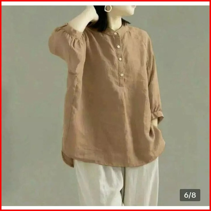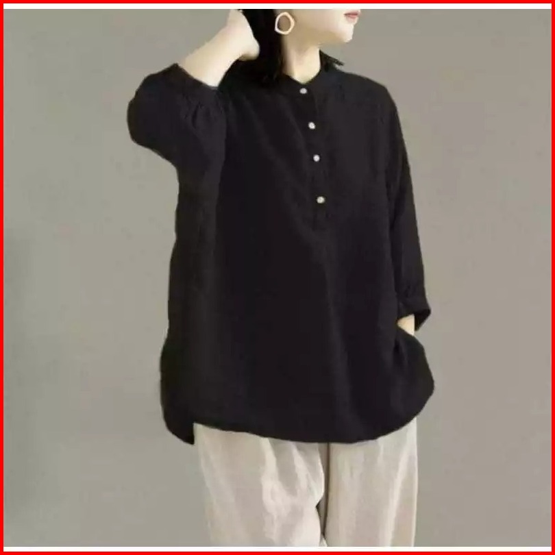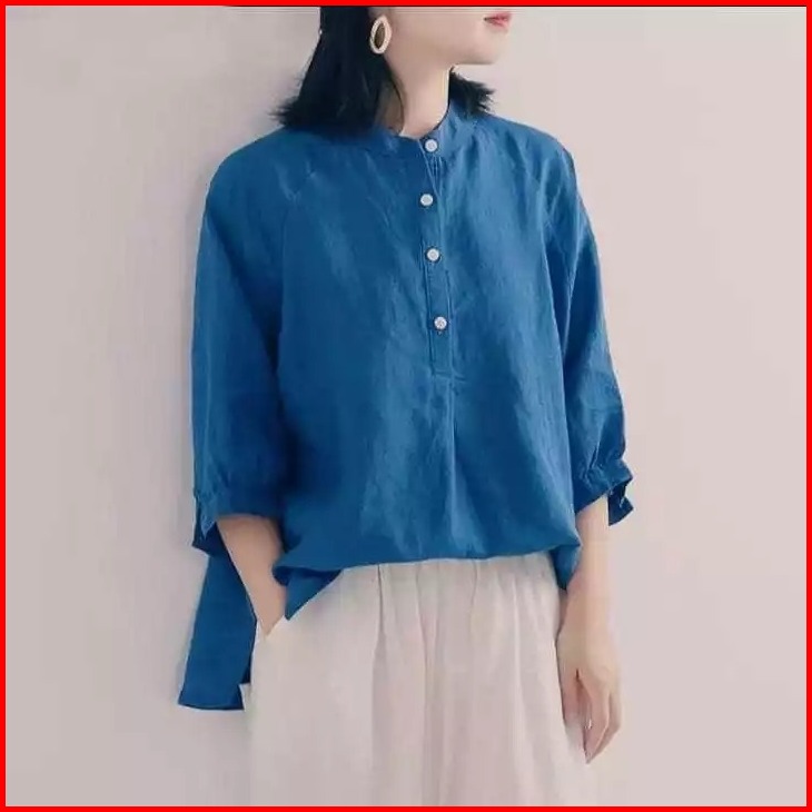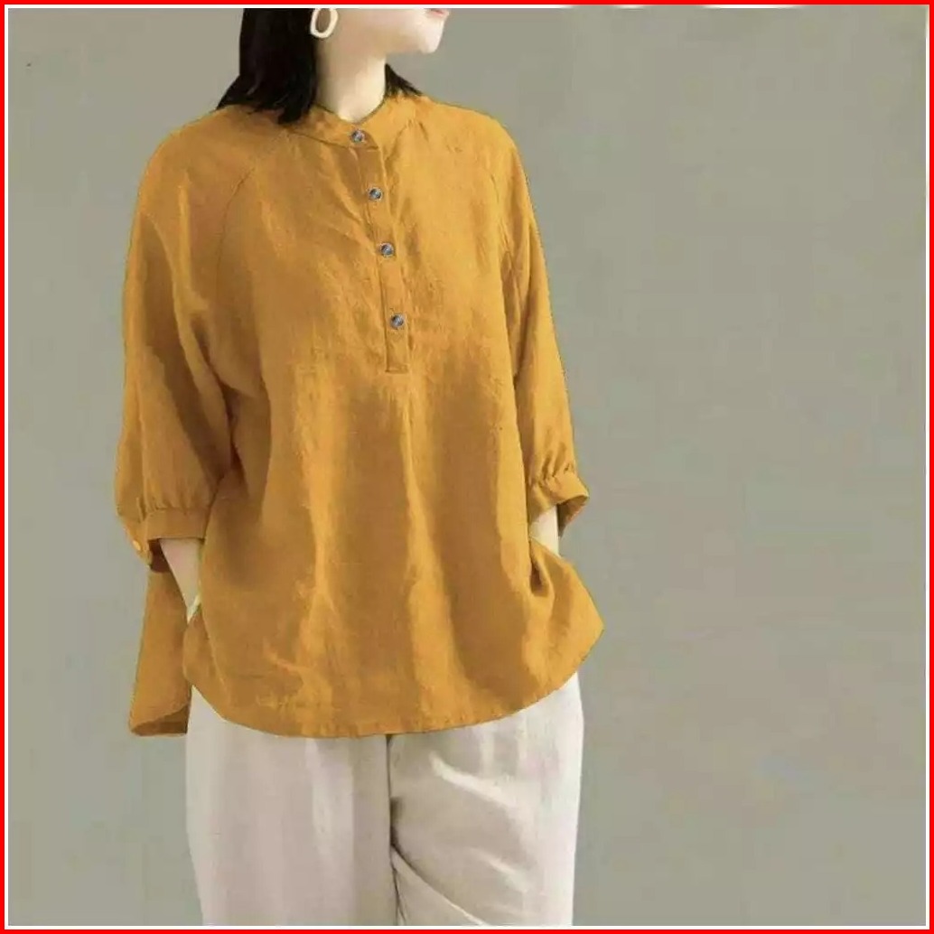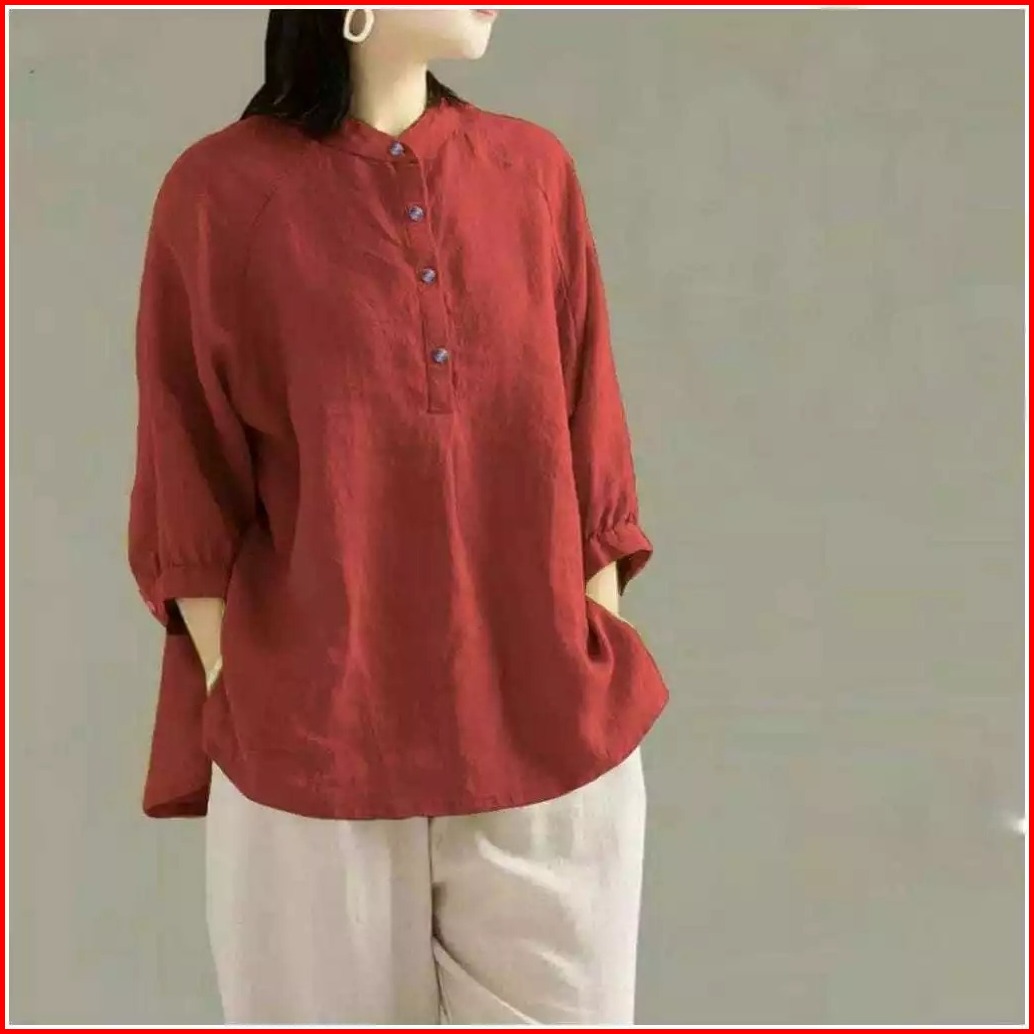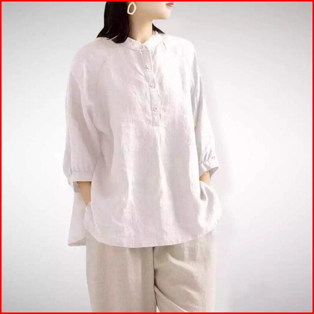 Kemeja Polos Linen Wanita Kerah Shanghai Kemeja Linen Oversize