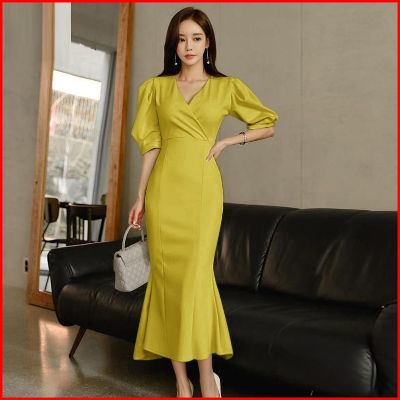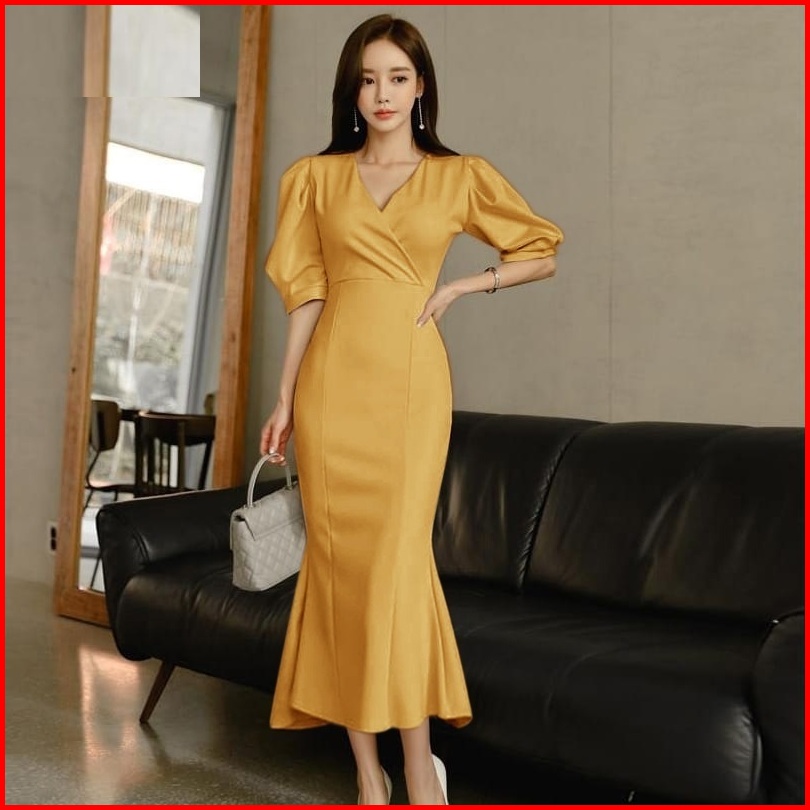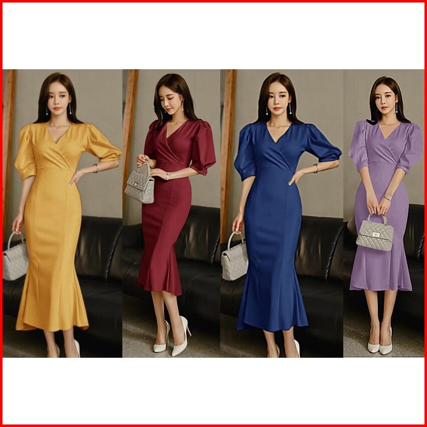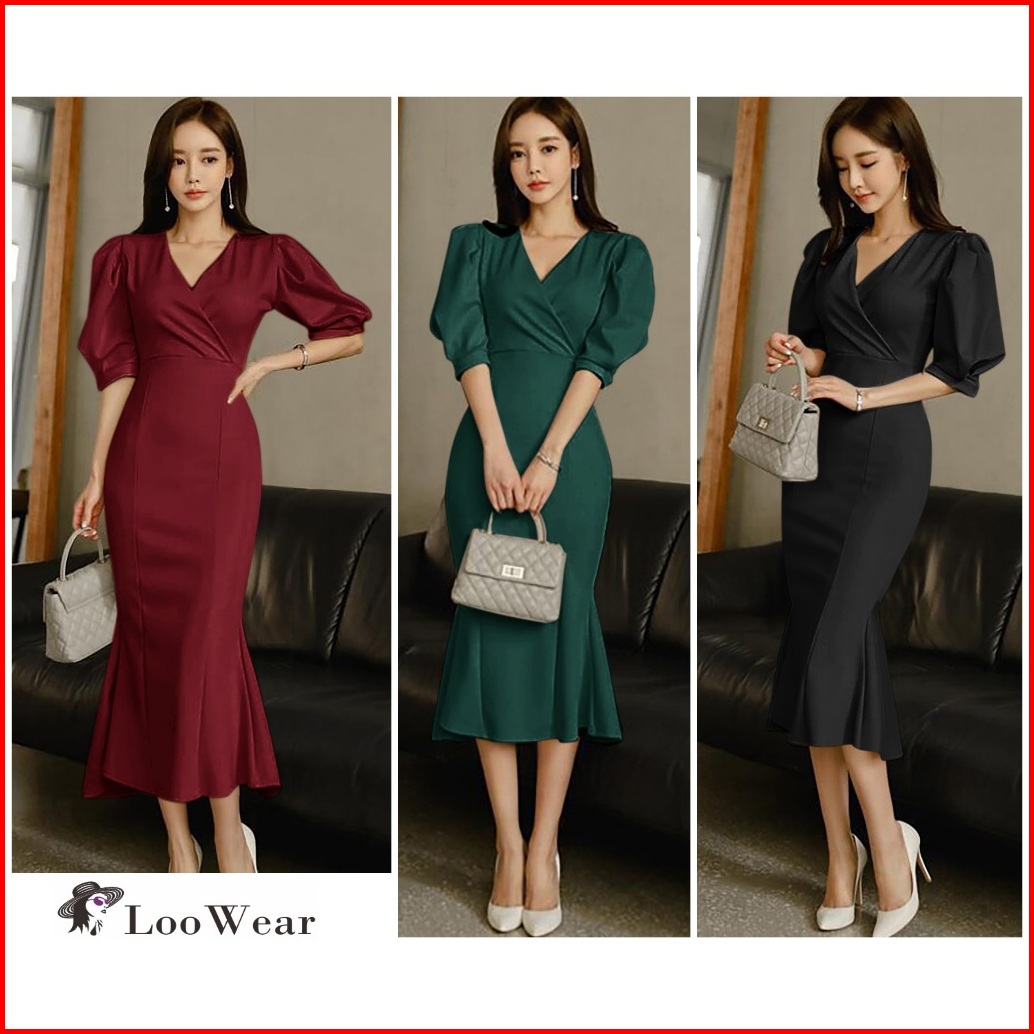 Loowear Bodycon Dress Pesta Mermaid Scuba Lengan Pendek Puff V-neck Polos Manis Cantik Korean Style Kekinian