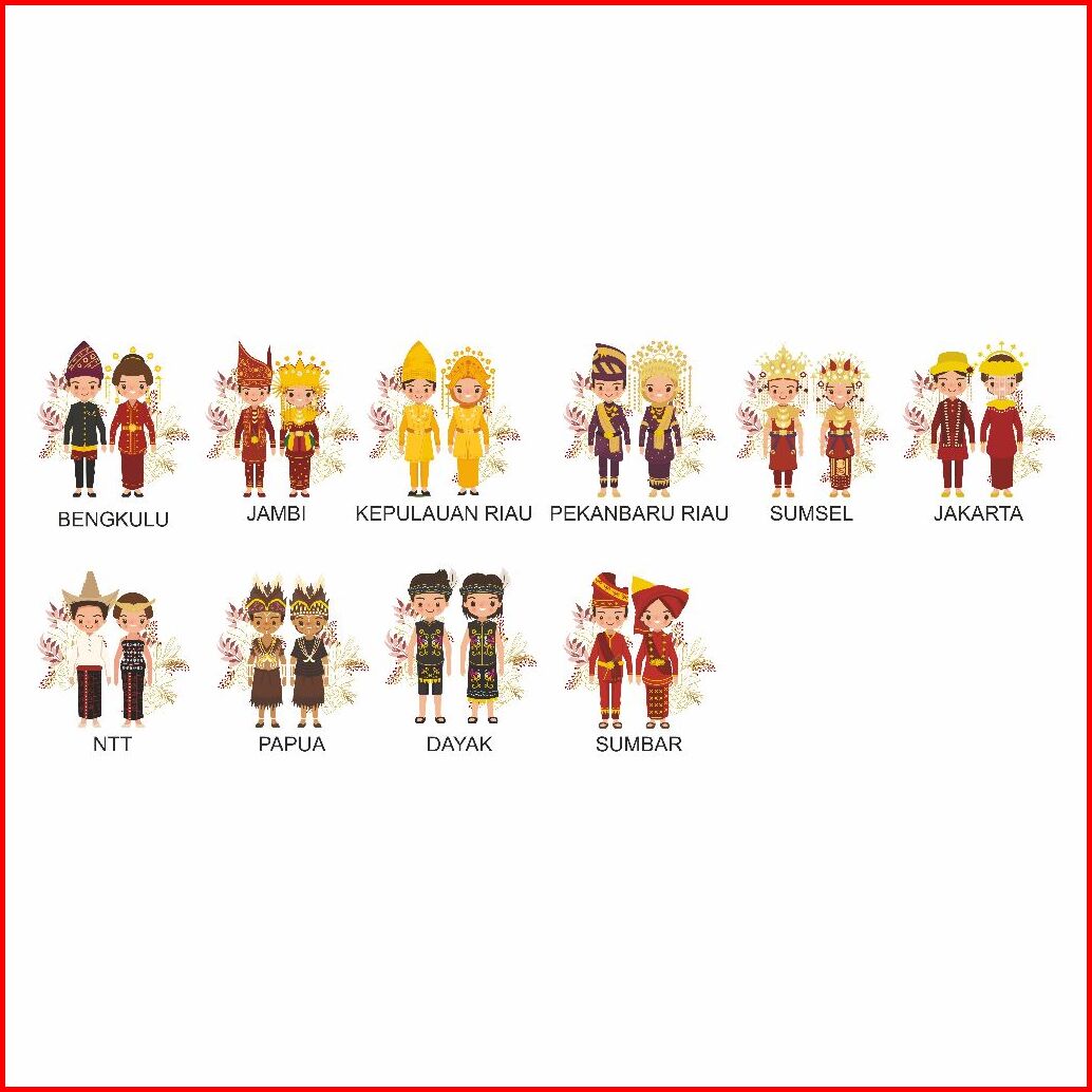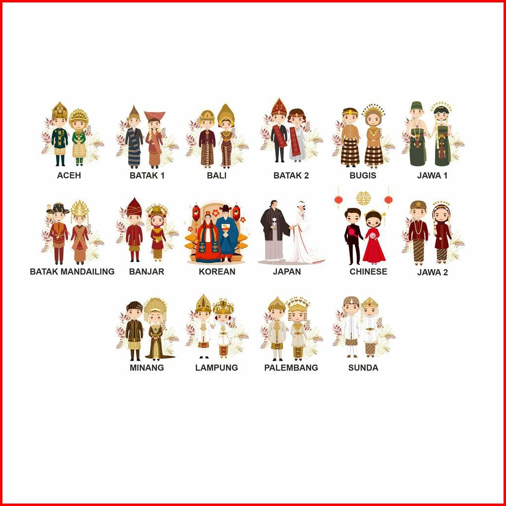 Adat Aceh, Adat Minang, Adat Batak 1, Adat Batak 2, Adat Mandailing, Adat Sunda, Adat Bali, Adat Lampung, Adat Palembang, Adat Jawa 1, Adat Jawa 2, Adat Banjar, Adat Bugis, Korean Couple, Chinese Couple, Japan Couple, Bengkulu, Jambi, Kepulauan Riau, Pekanbaru Riau, Sumsel, Jakarta, NTT, Papua, Dayak, Sumbar