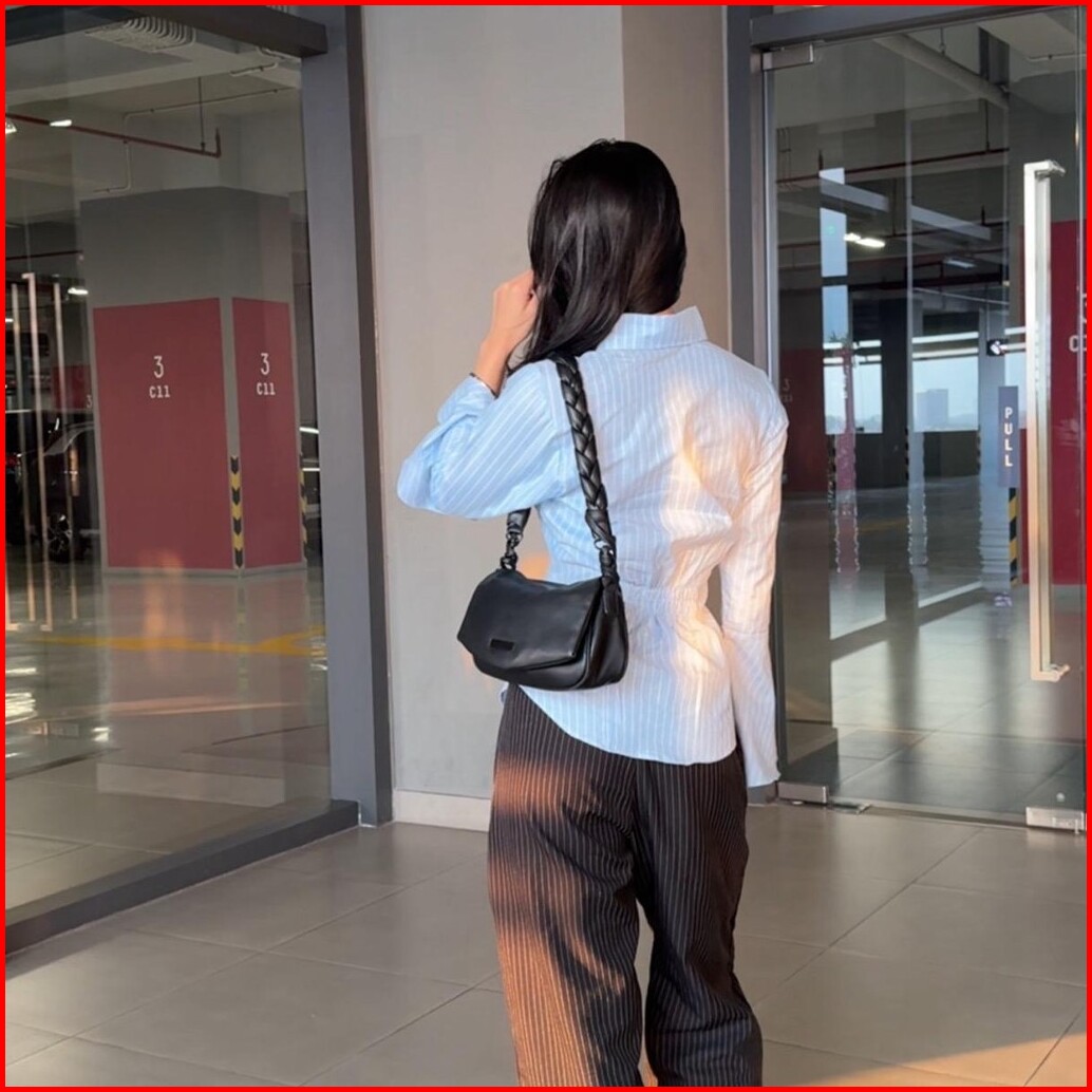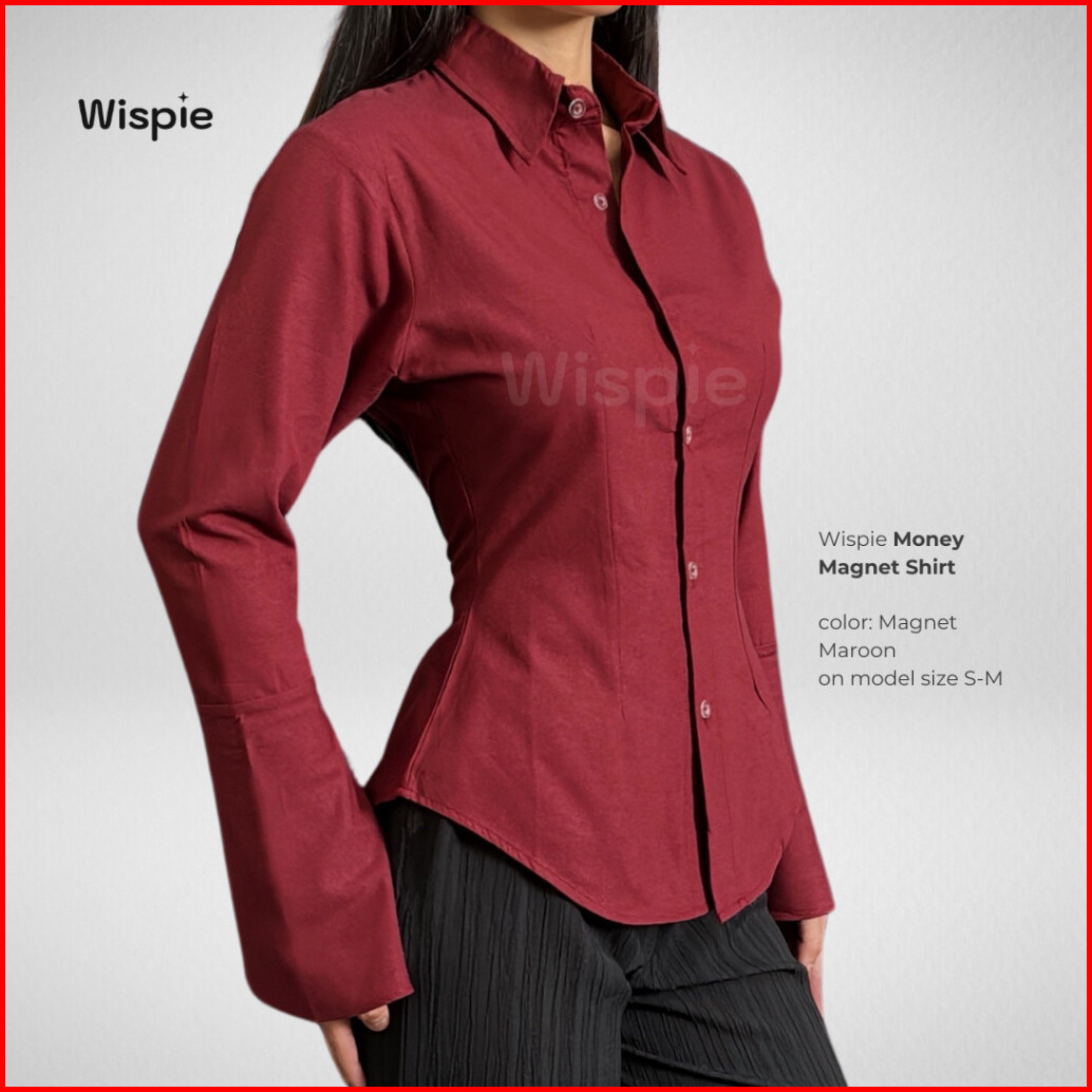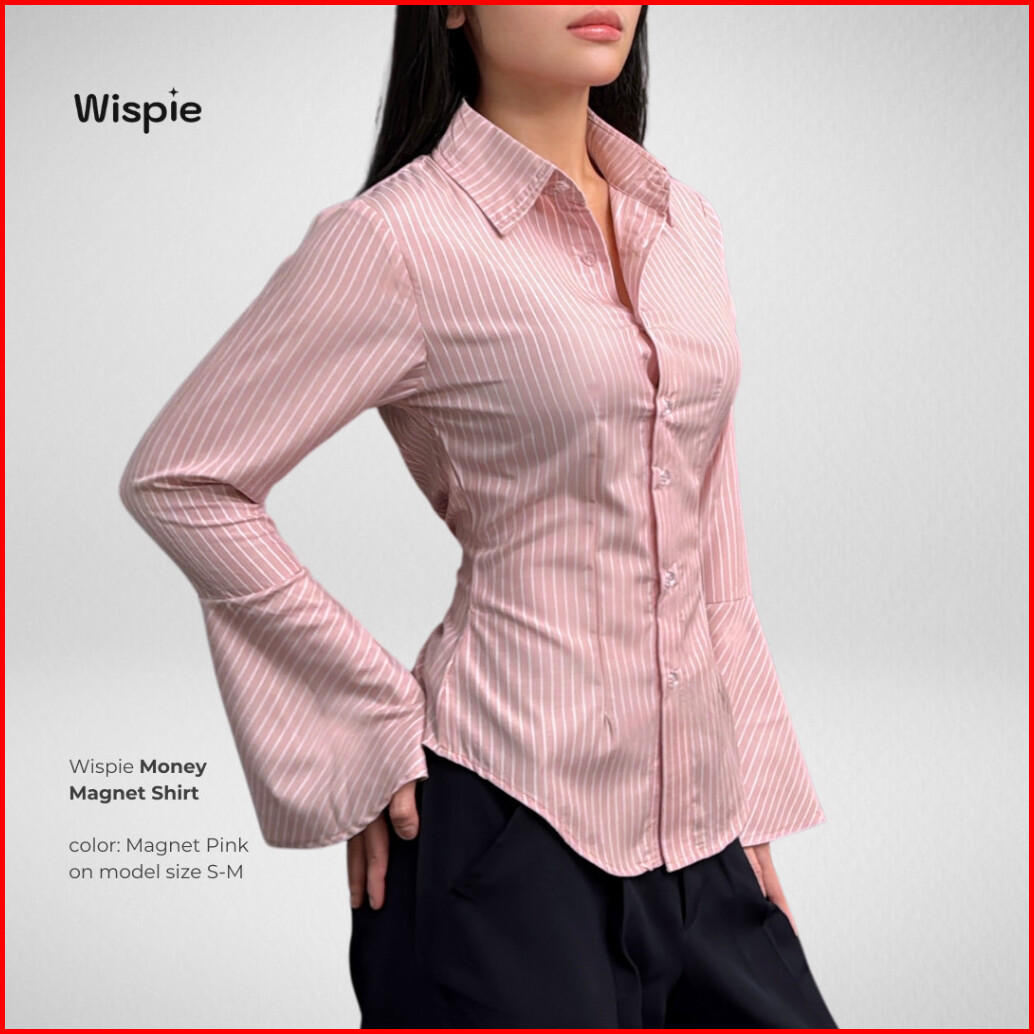 Wispie Money Magnet Fitted Shirt Kemeja Kerja Wanita Press Body Pinstripe Salur Pink Biru Berkaret