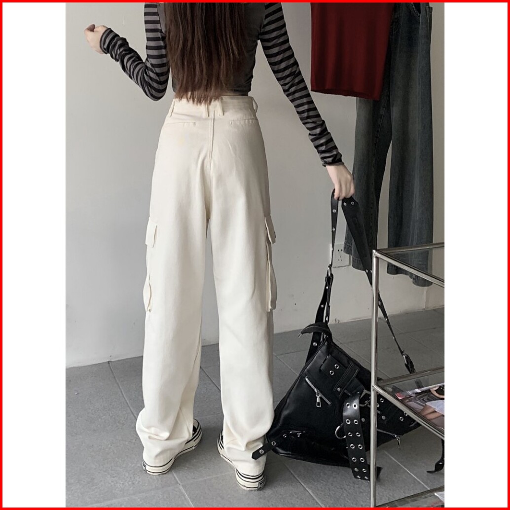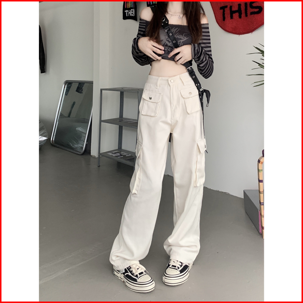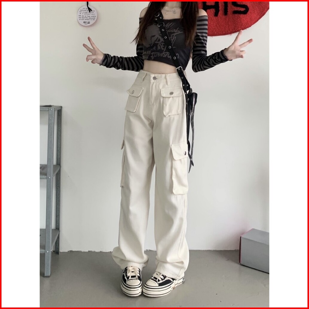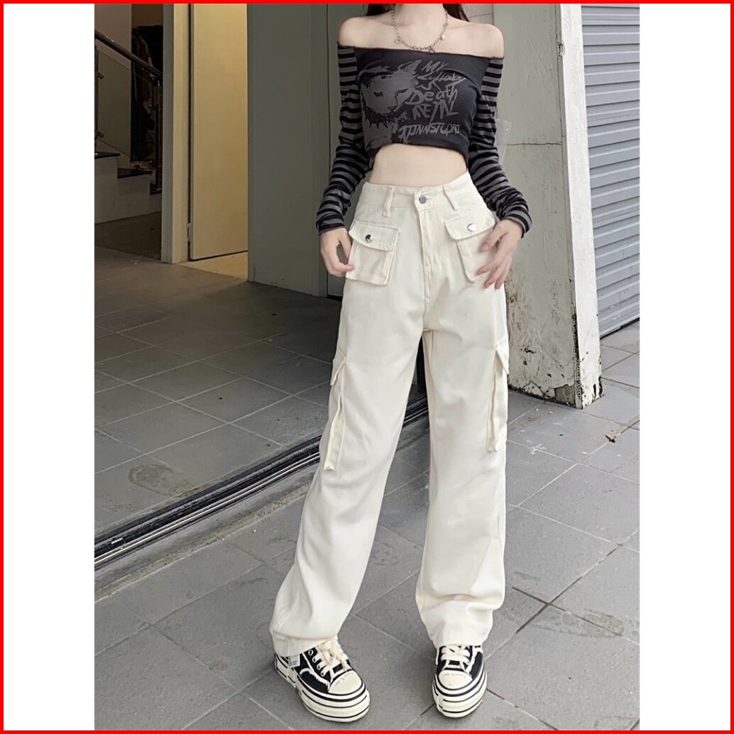 Ship Locally Pakaian Wanita Premium Krem Newahighwaist Cargo Celana Jeans Celana Jeans Wanita