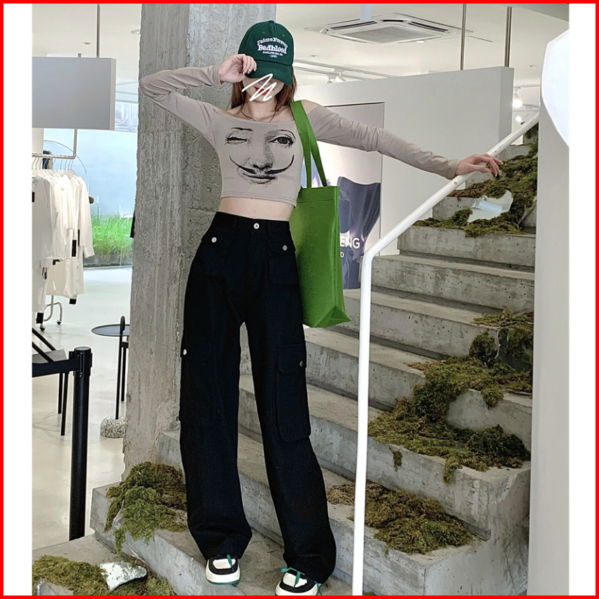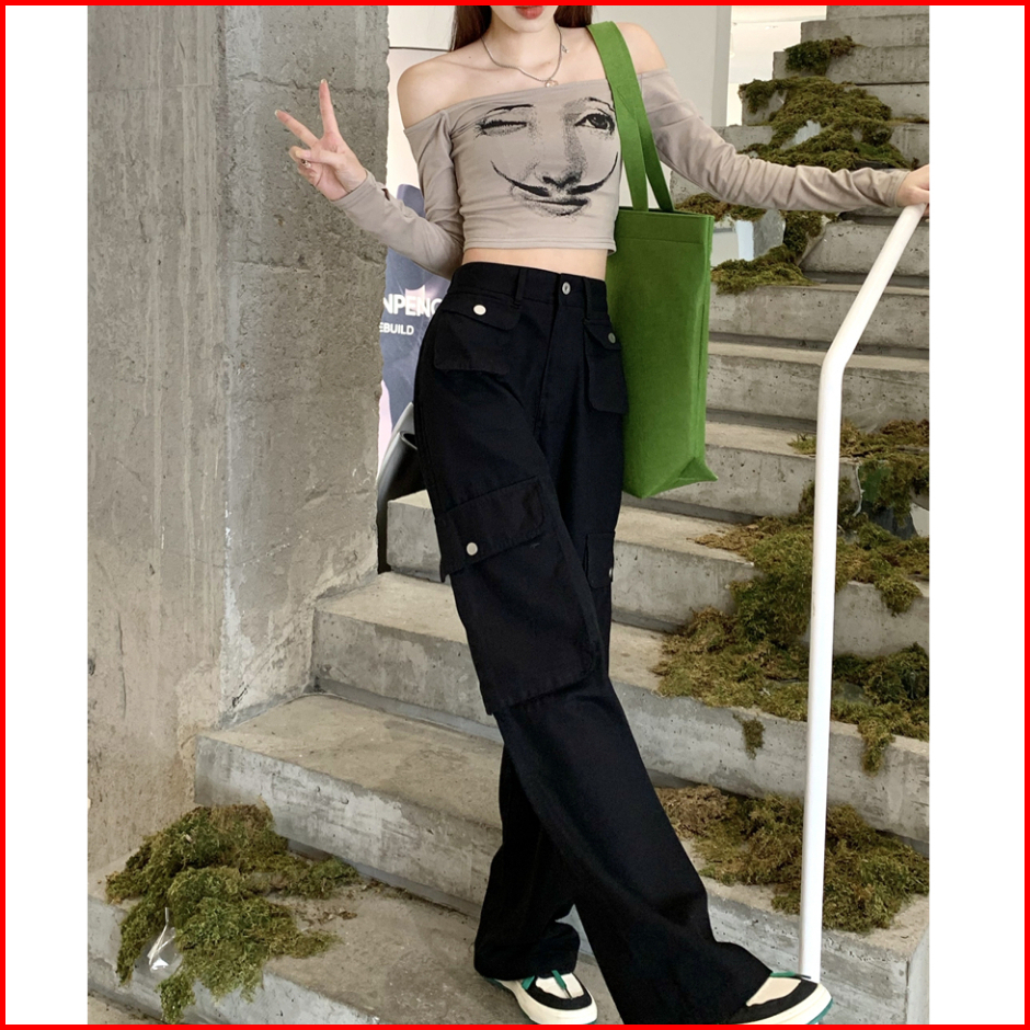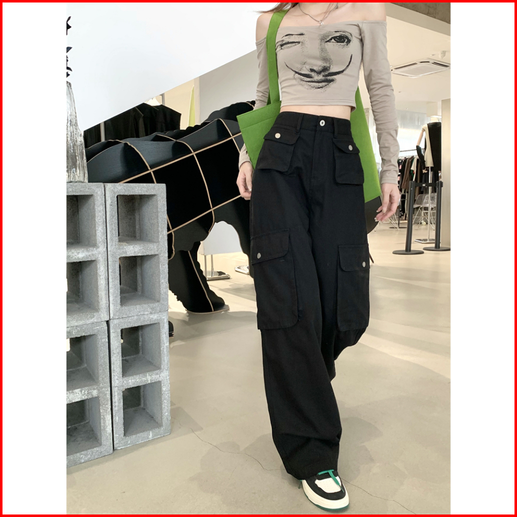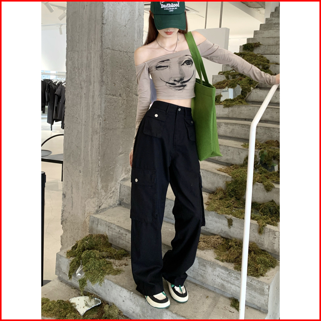 Ship Locally Pakaian Wanita Premium Krem Newahighwaist Cargo Celana Jeans Celana Jeans Wanita