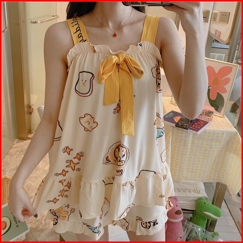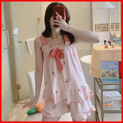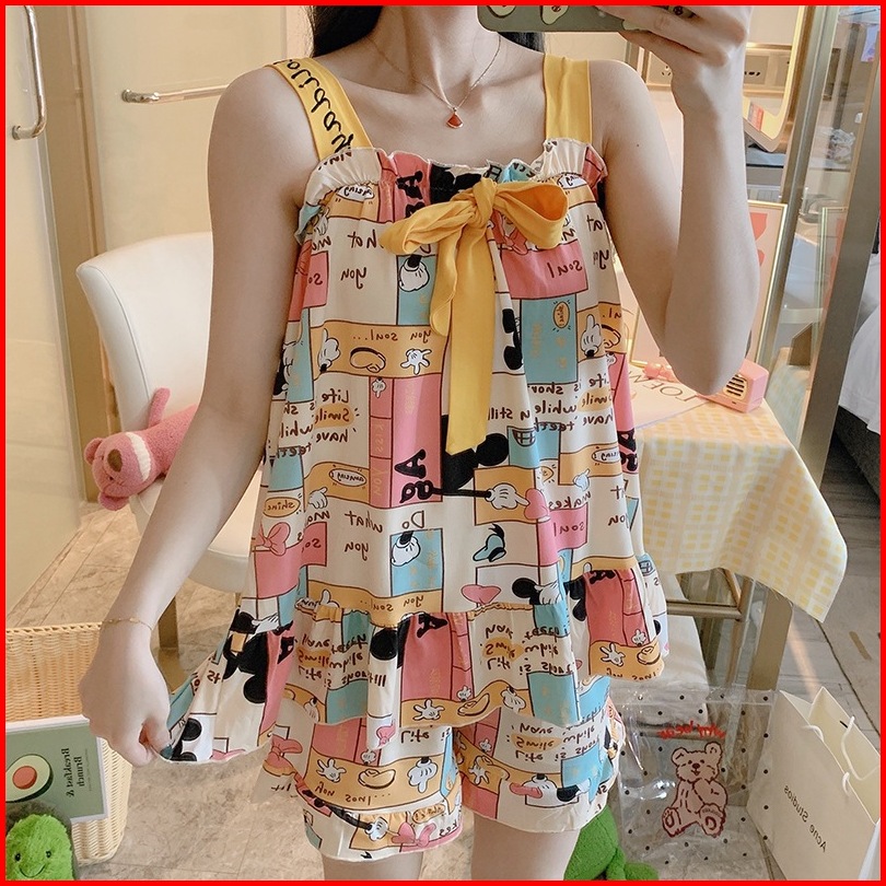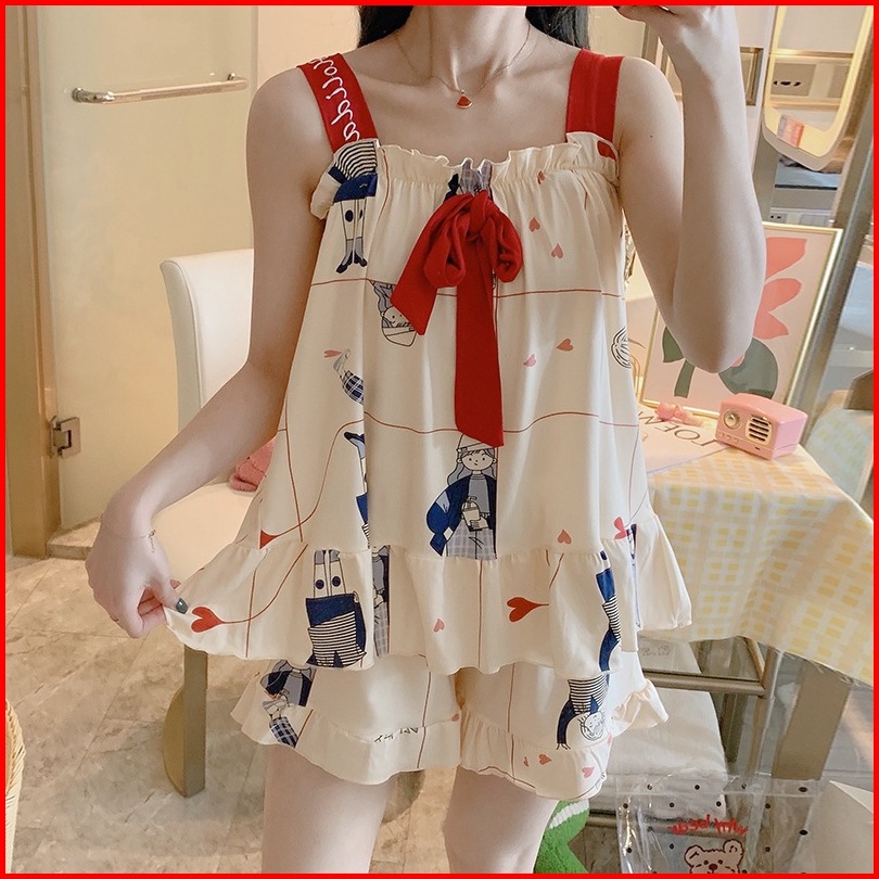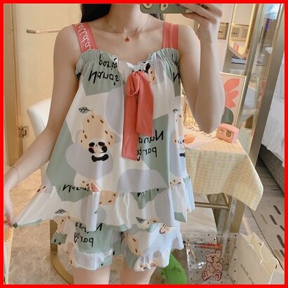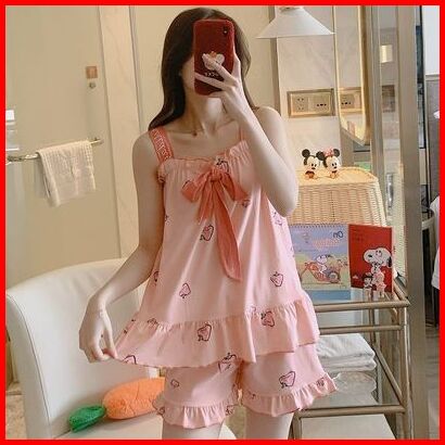 Setelan Baju Tidur Wanita Dewasa Lengan Kutung Celana Pendek Bahan Katun Polyester Adem Licin Serap Keringat Motif Karak