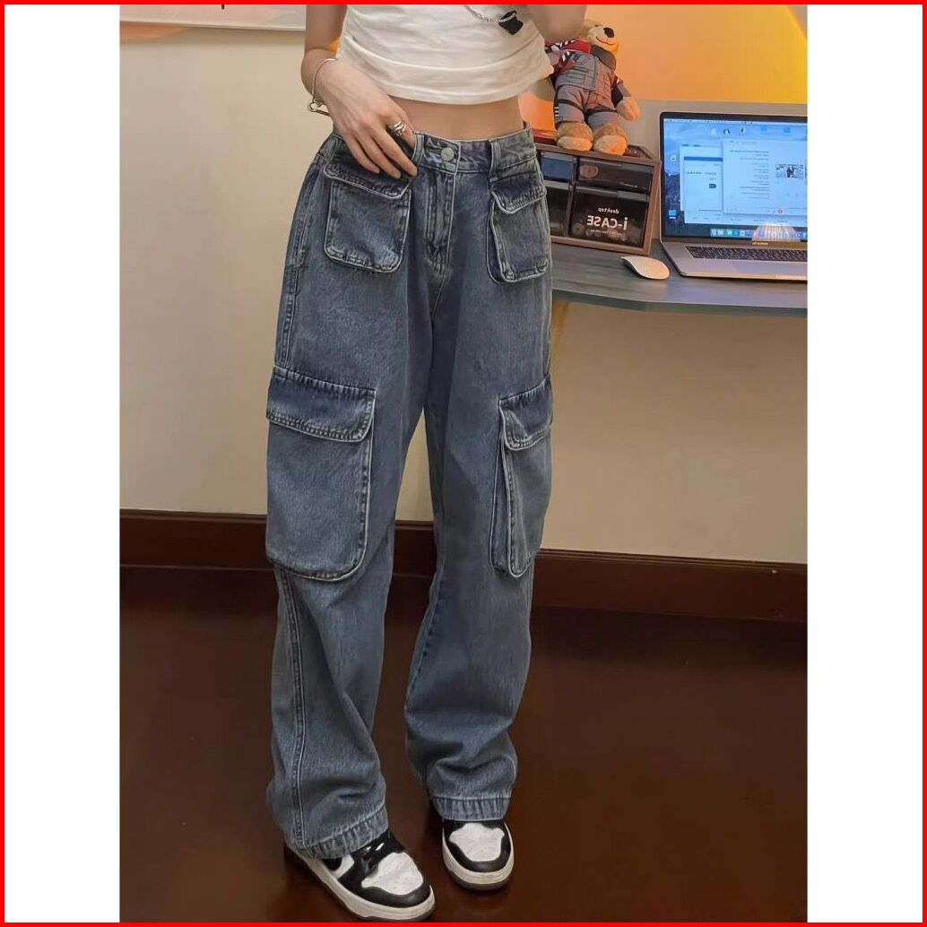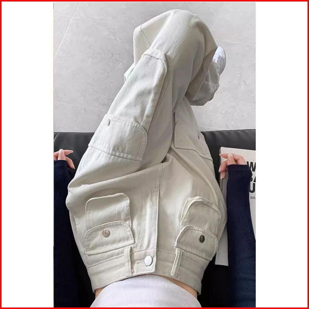 Cargo Denim Pasir Putih Hightwaist Loose Celana Jeans Wanita Korea Preium