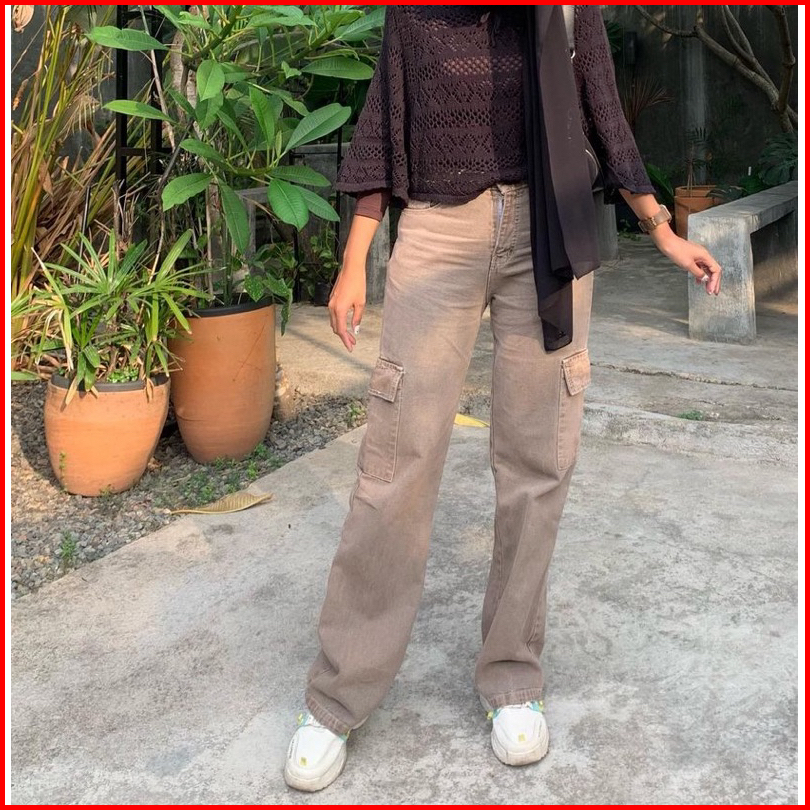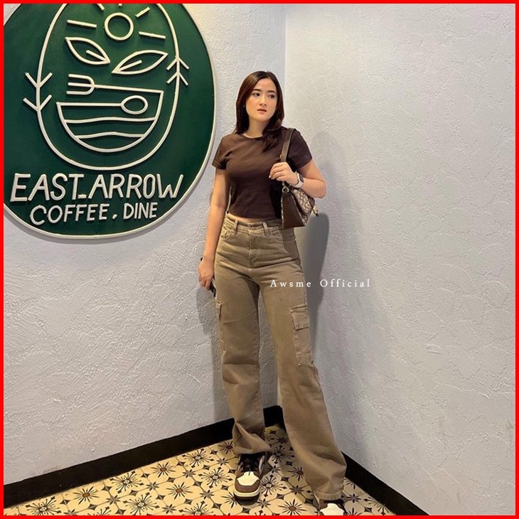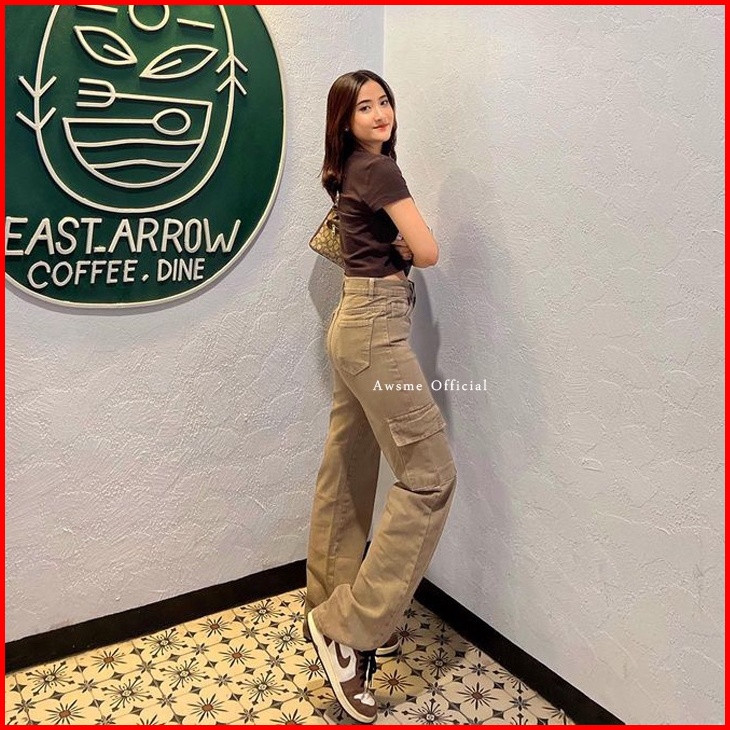 Awsme - Cargo Jeans Mocca Highwaist Loose Cargo Jeans Pants Wanita