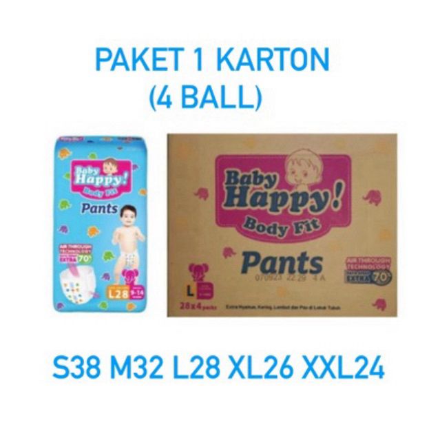 Pempes baby happy ukuran l 1 dus PAKET 1 KARTON (4 Ball) BABY HAPPY pants Celana popok bayi S38 M32 L28 Xl26 XXL24