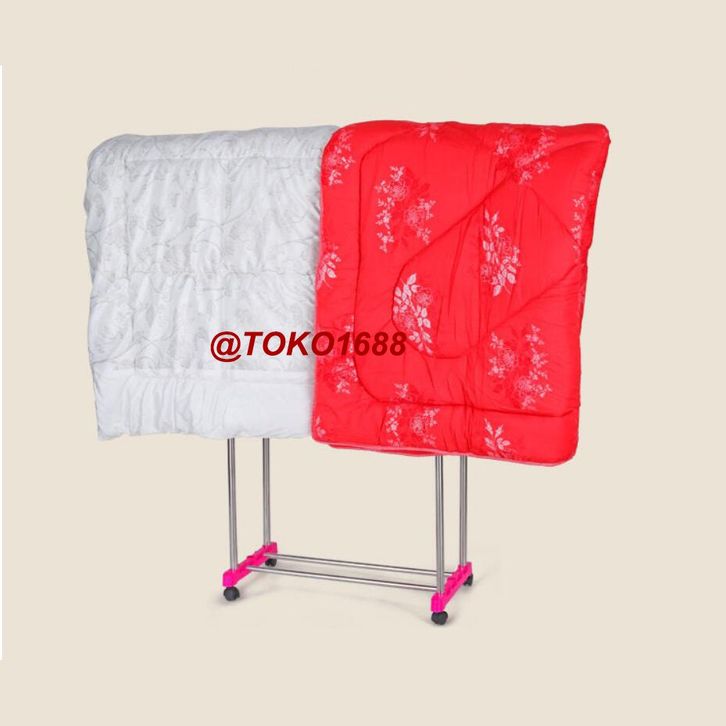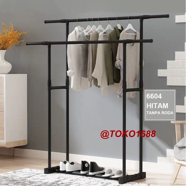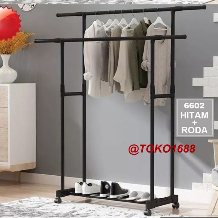 Stand hanger double rak baju serbaguna 2 sisi dengan 4 roda Hitam