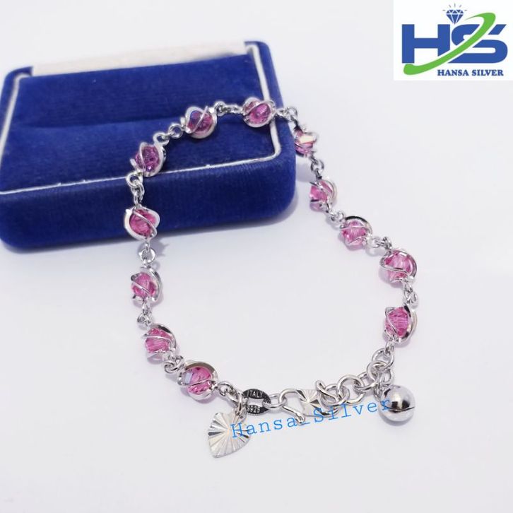 Gelangg Perak Asli Silver 925 Lapis Emass Putih Model Batu Kristal Pink - Perhiasan Perak Wanita