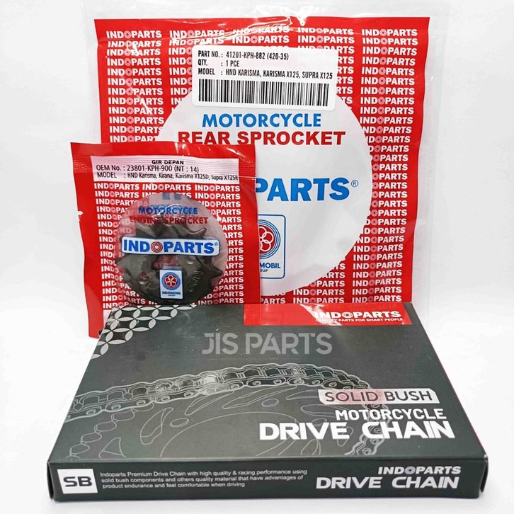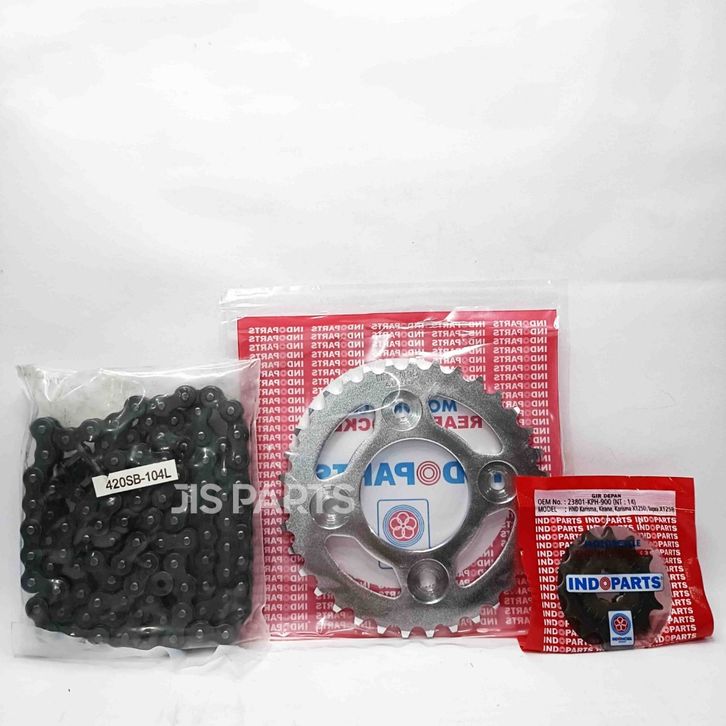 GEAR SET INDOPARTS SUPRA X 125 KARBURATOR KARISMA BLADE REVO MERK INDOPARTS GIR PAKET RANTAI ORISINIL 14 - 35 420 - 104