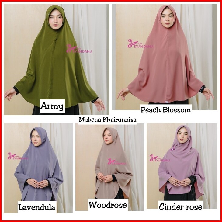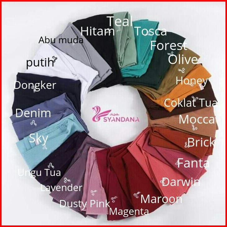 Hitam, Dongker, Maroon, Denim, Woodrose, Hijau Army, Lavendula, Peach blossom, Cinder rose, Ungu Tua, Mocca, Darwin, Tosca, Teal, Coklat Tua, Abu muda, Lavender, Olive, Dupink, Forest, Honey, Magenta, Matcha, Putih, Henna, Rose, Fossil, Cury, Sage, SKY