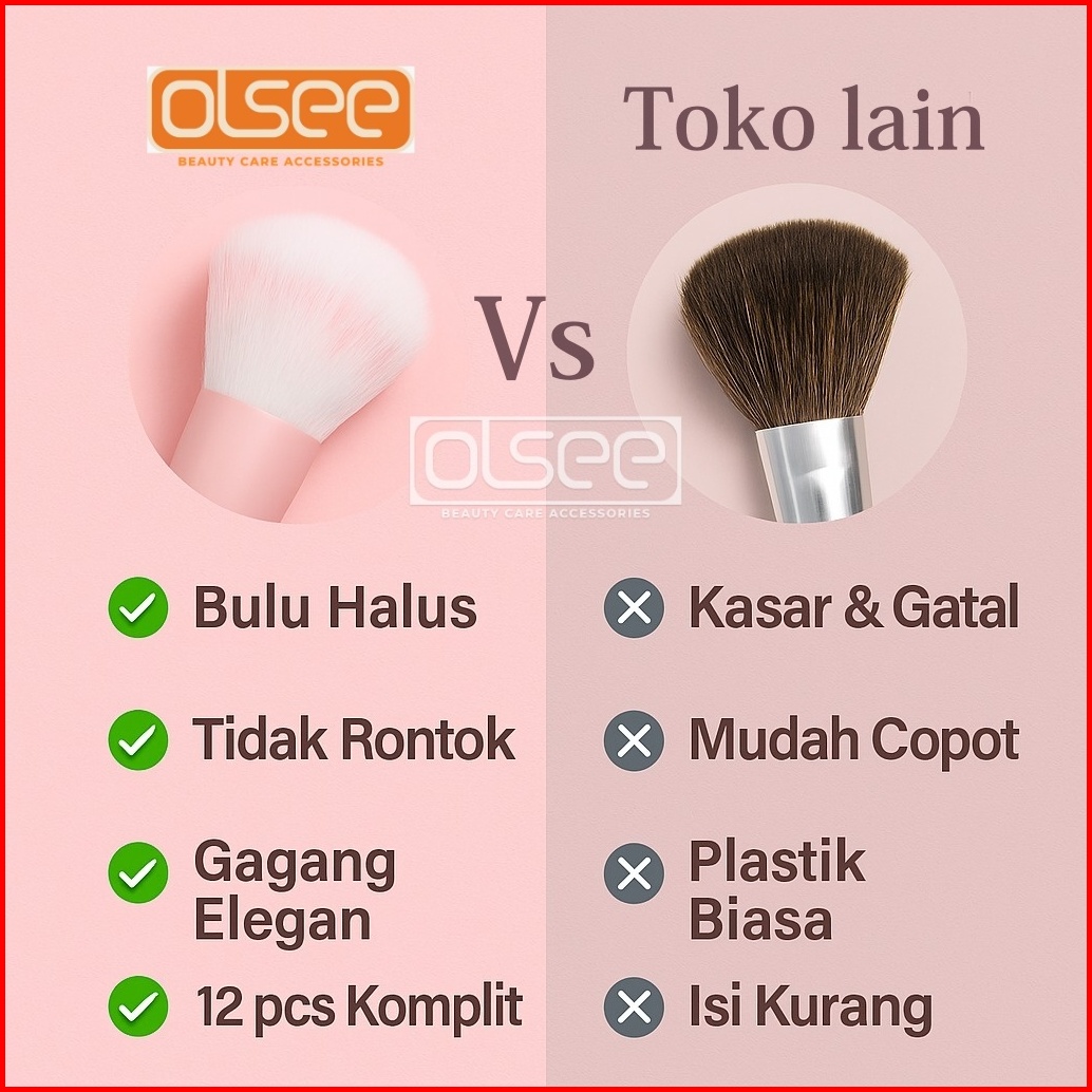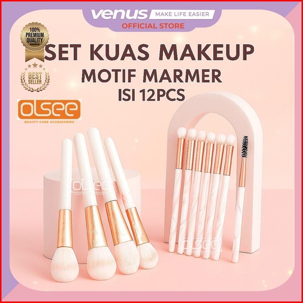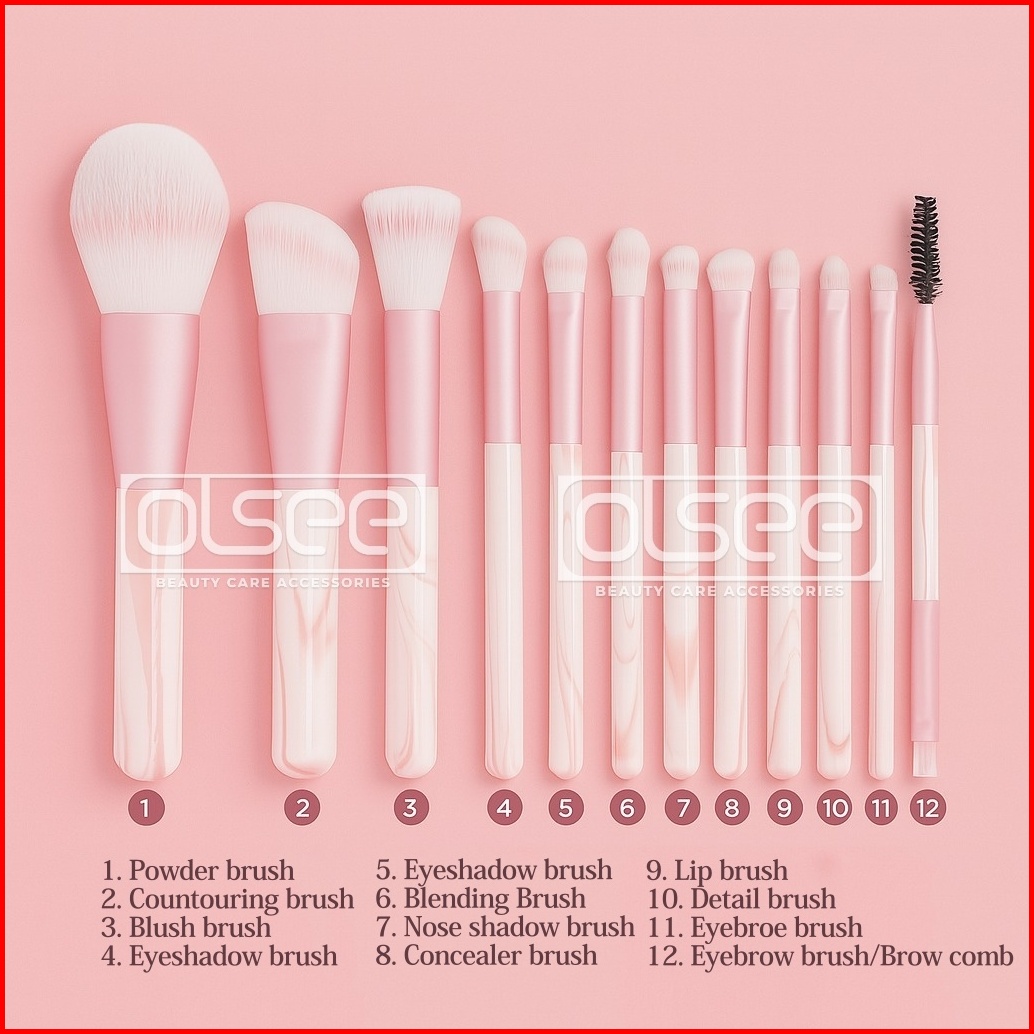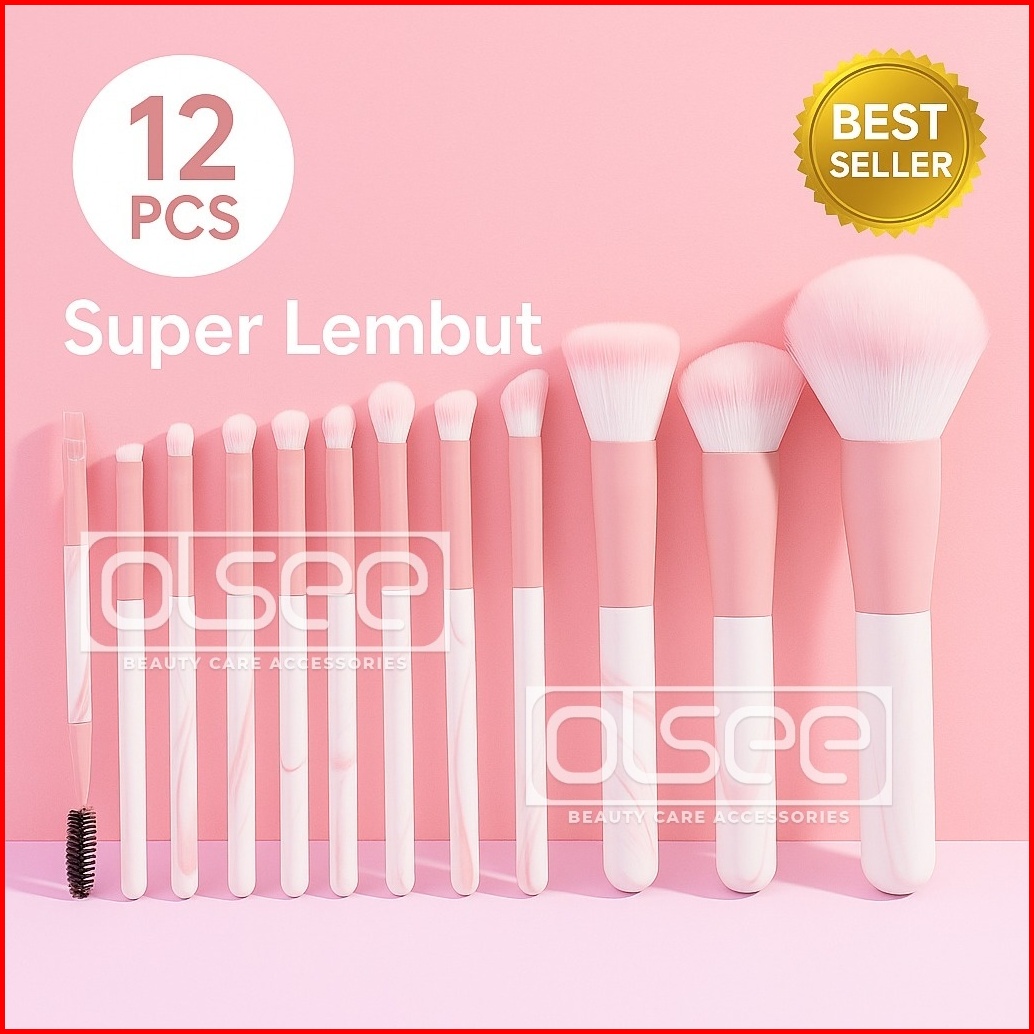 Olsee 12pcs Brush Makeup Marmer Pink Kuas Foundation Blending Eyeshadow Lipstik Kuas Makeup Set S1259