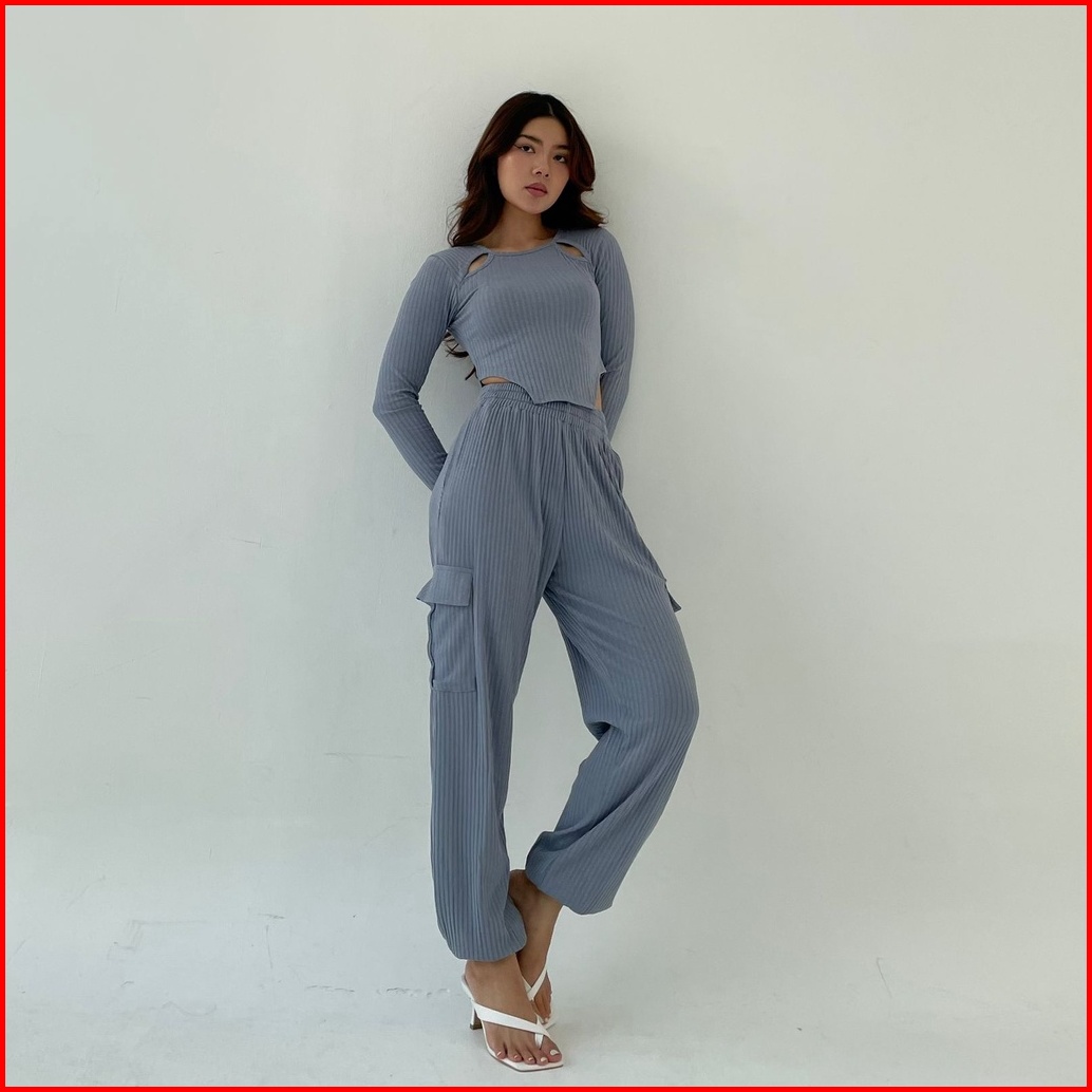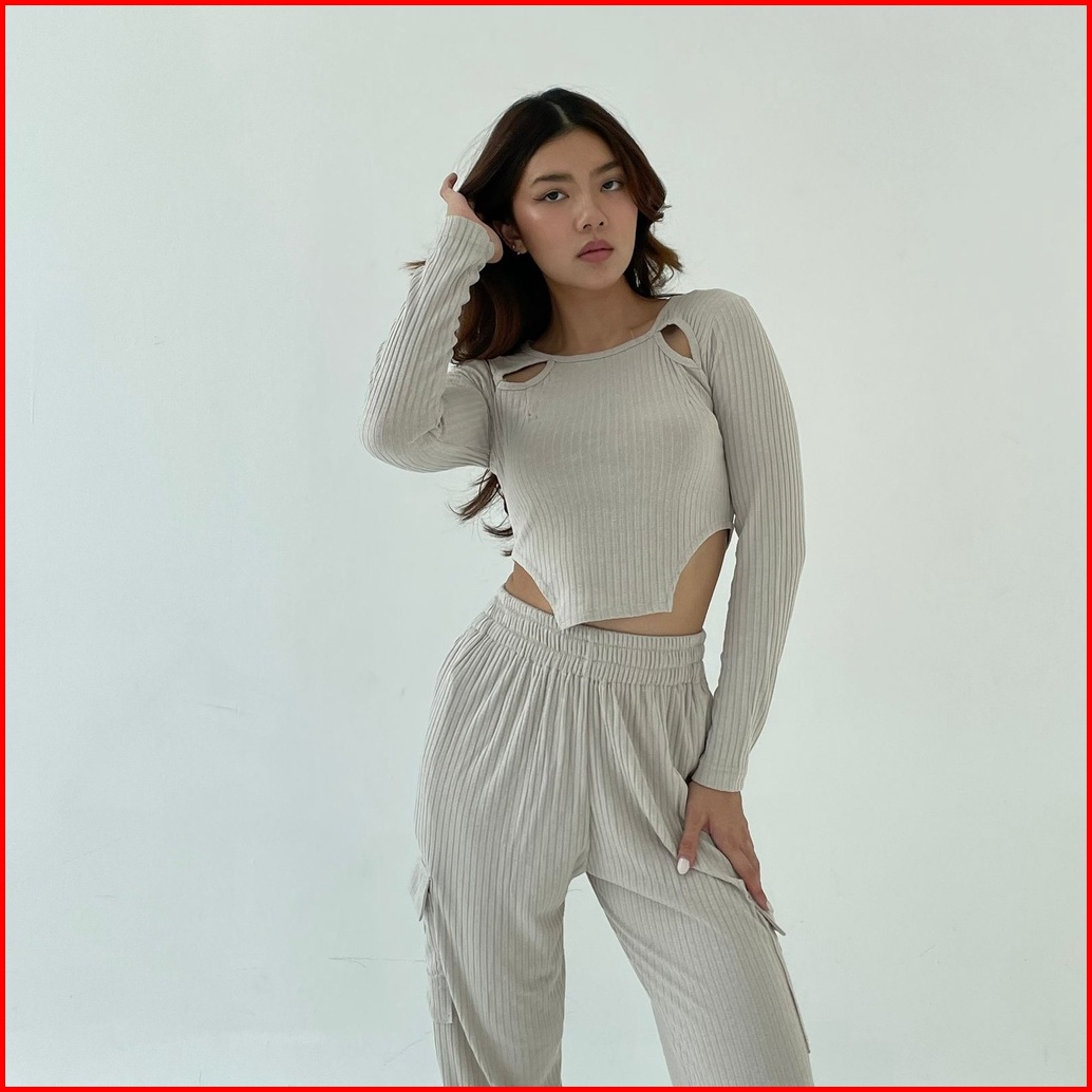 Wednesday Set Setelan Wanita Ribbed Knit Set Lengan Panjang Celana Panjang Highwaist Highwaisted Cargo Pants