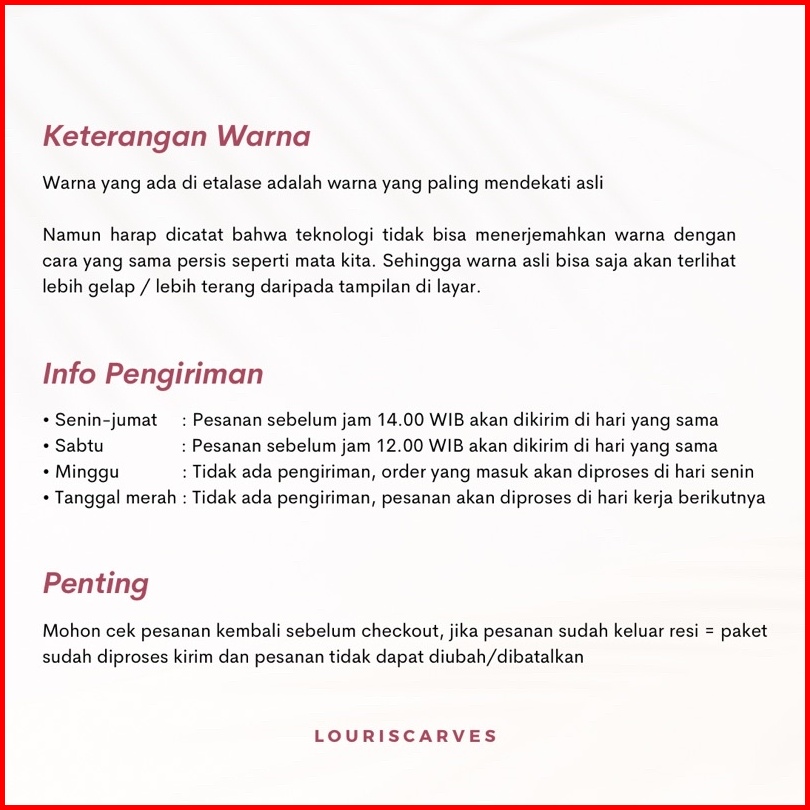 Jetblack, Navy, Latte, Khaki, Masami, Mocca, Turkish, Tapestry, Coklat Pramuka, Coffee, Putih bersih, BW, Chocopink, Dash, Irish, Daisy, Shiro, Shell, Flamingo, Seedpearl, Saloma, Athena, Jasmine, Lily, Mulberry, Tally, Space Grey, Midgrey, Miggle, Castrol, Carbon, Silverblue, Smoke Grey, Silvermist, Oasis, Dark Jeans, Stormi, Kabuki, Forest, Matcha, Wakana, Evergreen, Pickle, Red Ruby