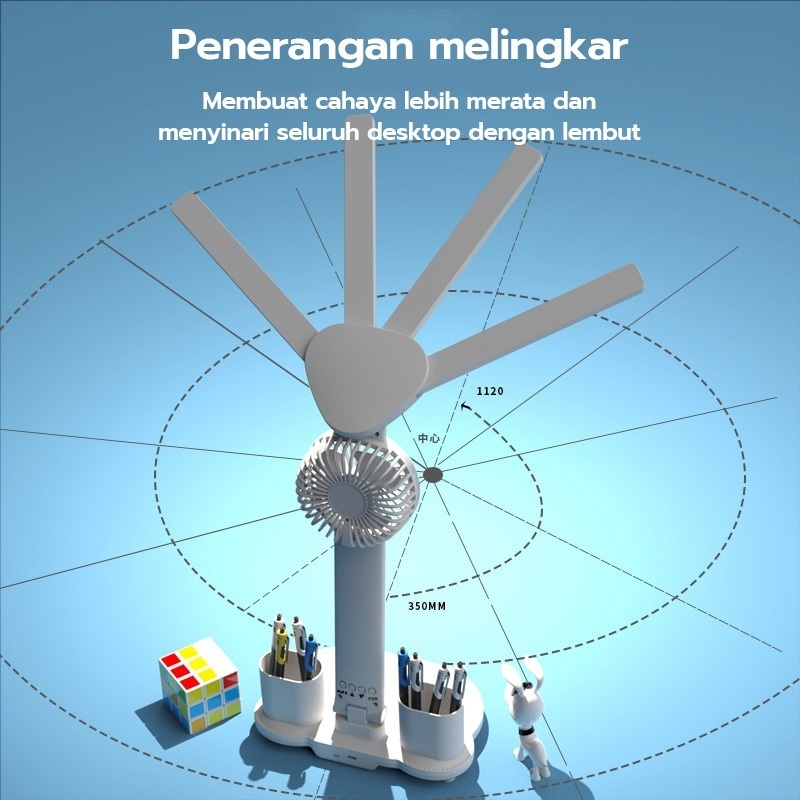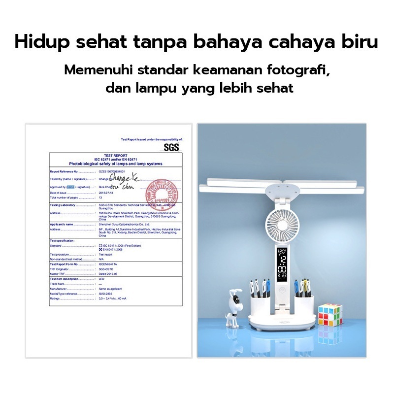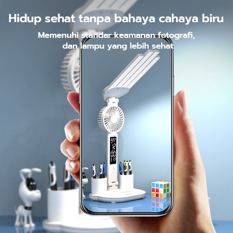 Ready Garansi 3 tahun Lampu Meja Multifungsi 3in1 LED Lipat Empat Kepala dengan Kipas Jam Kalender Lampu Meja USB Isi Ul