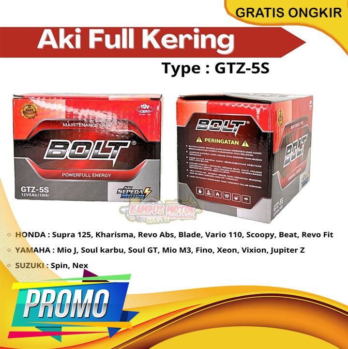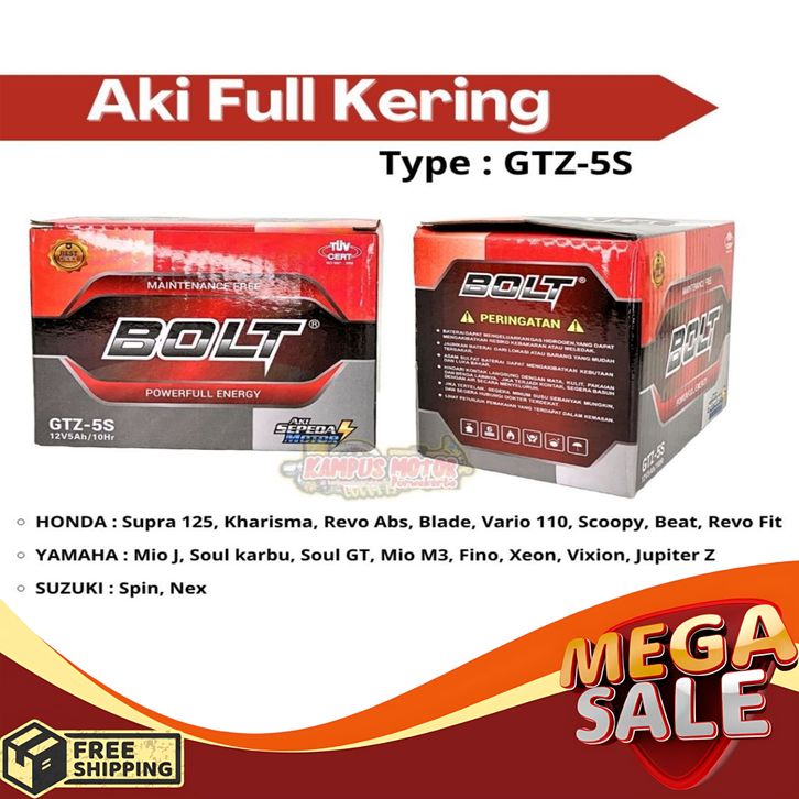 Aki Full Kering GTZ-5S 12V5Ah/10Hr Merk BOLT | Batrei motor kering gtz5s kharisma beat jupiter