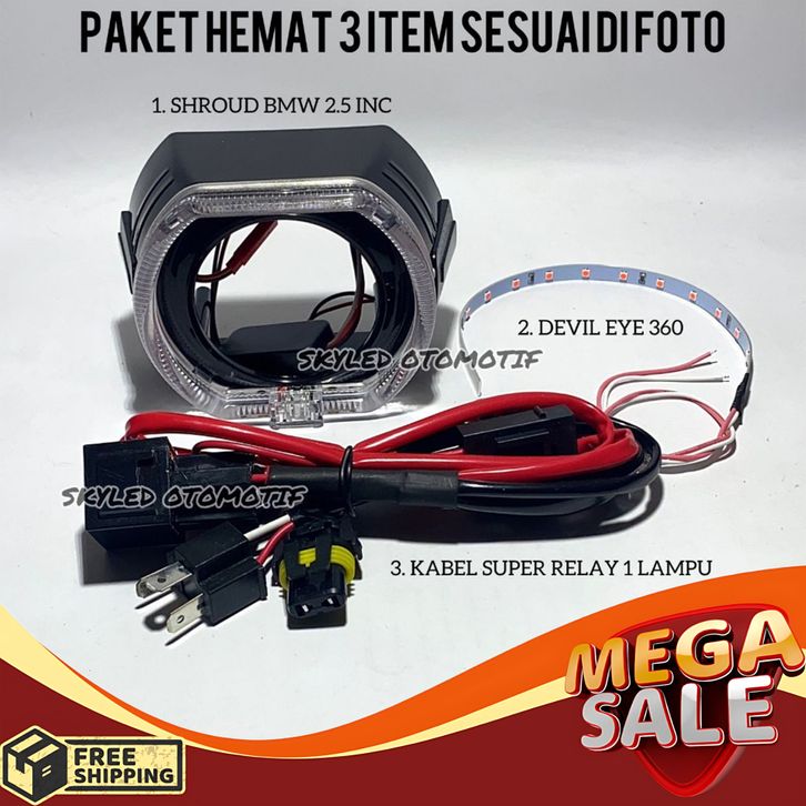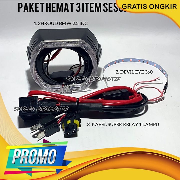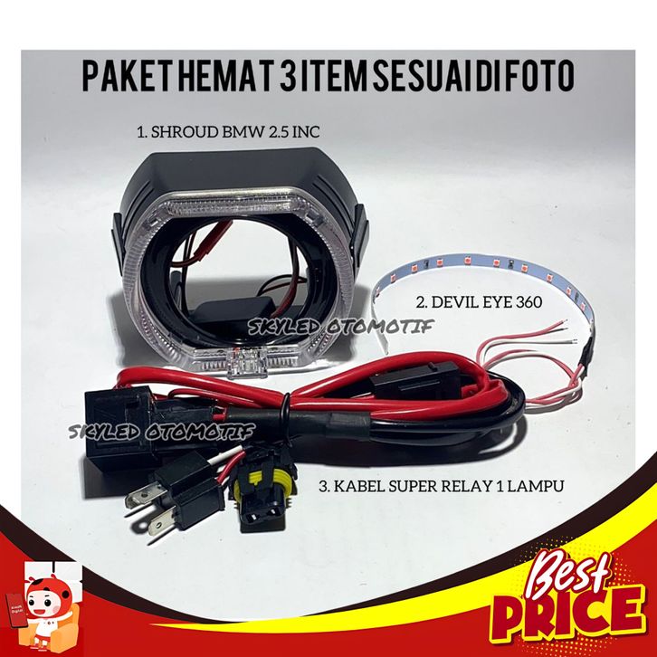 Paket Hemat 3In1 Shroud Bmw Black Housing 2.5 Inch + Kabel Super Relay Set Biled Motor + Devil 360