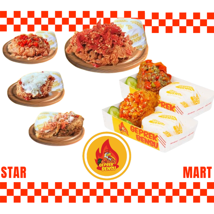 PAKET AYAM GEPREK KEJU, PAKET AYAM GEPREK, PAKET AYAM GEPREK LELEH, PAKET AYAM GEPREK SAOS TELOR ASIN, PAKET AYAM GEPREK SAMBEL MATAH, PAKET AYAM GEPREK CABE IJO, PAKET AYAM GEPREK SAMBEL TERI, PAKET AYAM GEPREK SAMBEL KOREA, Paket Geprek Bensu Ayam Tumbuk Sambal Daun Jeruk, Super Mix : 1/2 Nasi + 1/2 Mie + Ayam Tumbuk Samba, 2pc Ayam Goreng (Potongan Besar) + Tahu + Tempe + , 2Pc Ayam Goreng (Potongan Besar) + 2Pc Ayam Geprek, Super Bensu : 1 Nasi + 2 Ayam + 1 Sambal Geprek + , Super Triple : 3 Paket Geprek Bensu, Super 5 Bensu : 5 Ayam Geprek + 3 Nasi + 2 Sambal , Paket Hemat Ayam Bensu, Paket Geprek Bensu Ayam Tumbuk Sambal Embe, Paket Mie Geprek Bensu Ayam Tumbuk Sambal Embe, Paket Mie Geprek Bensu Ayam Tumbuk Sambal Daun Jer, Sambal Bawang / Ori, Sambal Matah, Sambal Embe, Tahu Geprek, Tempe Geprek, Terong Geprek, Jamur Geprek, Nasi Putih, Kulit Crispy, Fruit Tea 350 ML, Prim-a 600 ml, Es / Hangat Teh Manis, Es / Hangat Teh Tawar