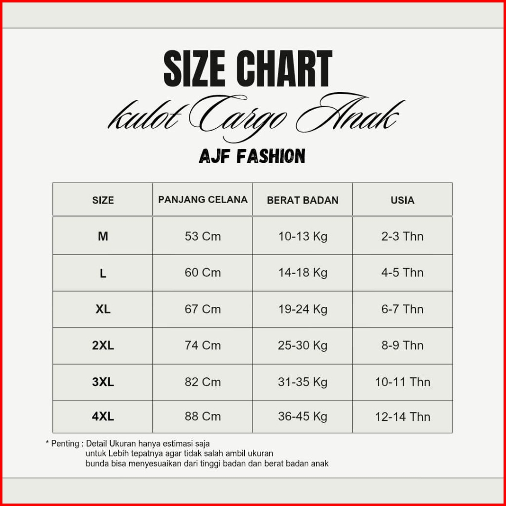 M = 2-4 thn, L= 4-5 thn, XL = 6-7 thn, No 24 = 8-9 thn, No 25 = 10-11 thn, No 26 = 12-14 thn