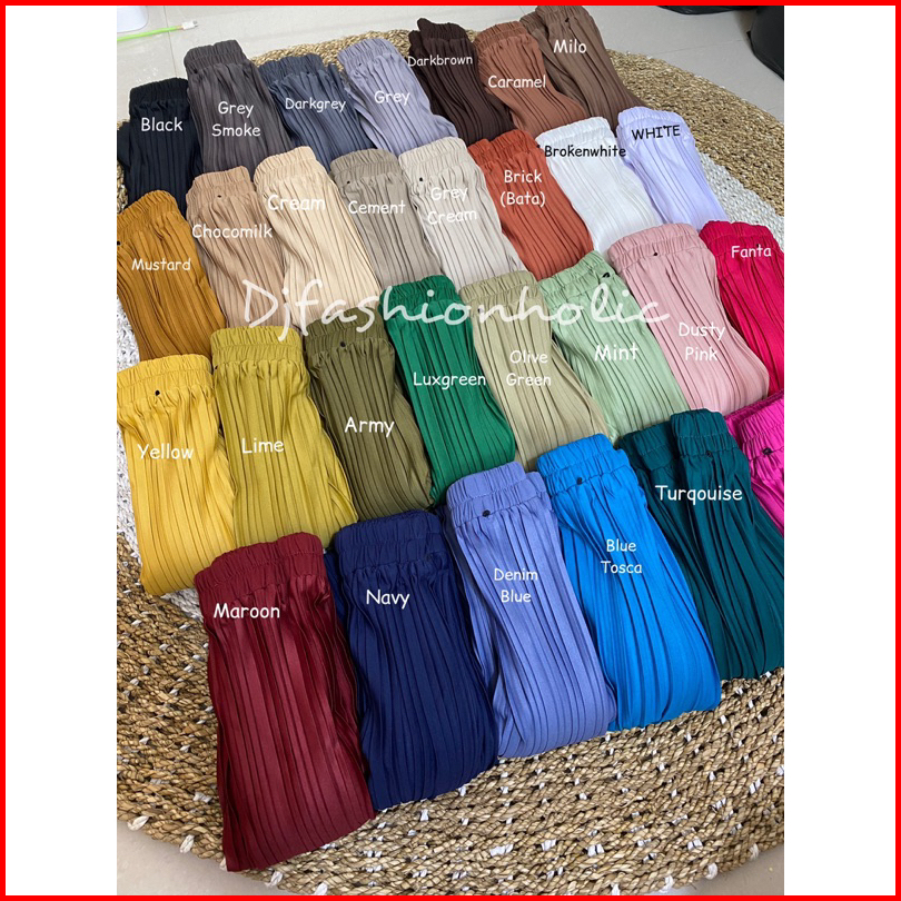 Baby magenta, Dustypink, Brokenwhite, Fanta, Yellow, Luxgreen, Mint, Olivegreen, Army, Limegreen, Denimblue, Navy, Maroon, Black, Brick (bata), Blue tosca, Turqouise, Greycream, Cement, Khaki, Chocomilk, Mustard, Milo, Caramel, Darkbrown, WHITE, Grey, Darkgrey, Greysmoke, Fuschia, Xanadu, Royalblue, Slategrey, Silver/lightgrey, Deep Army, Skyblue, Blue BCa, Tosca, Hijau botol, Baby mauve, Pinkpurple, Mocca, Peanut, Wood, Salmon, Burgundy, Thaitea, Cream, Walnut, Red (Merah)