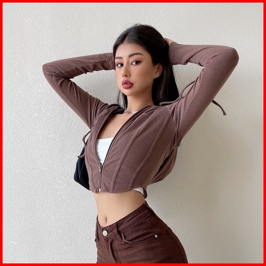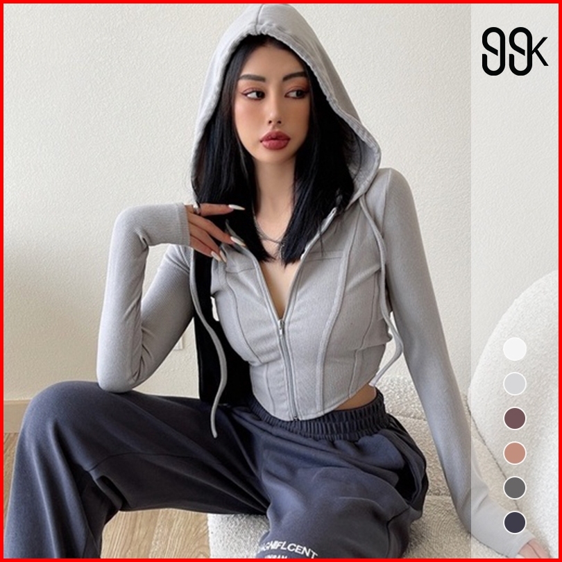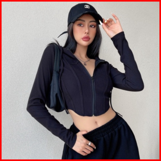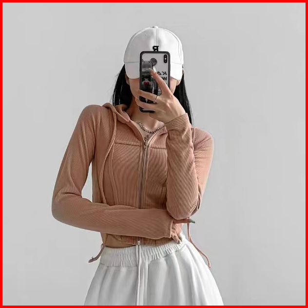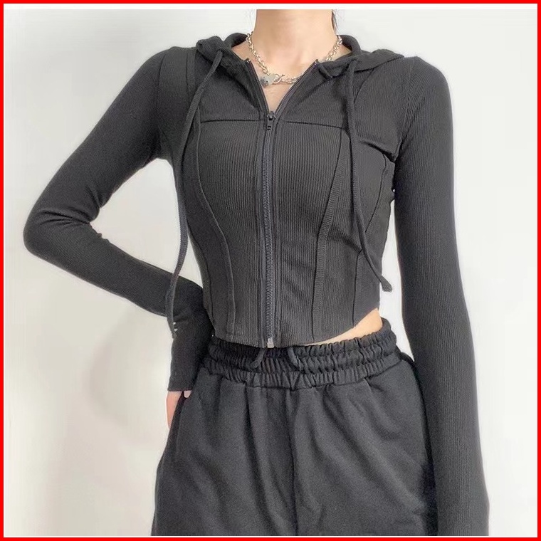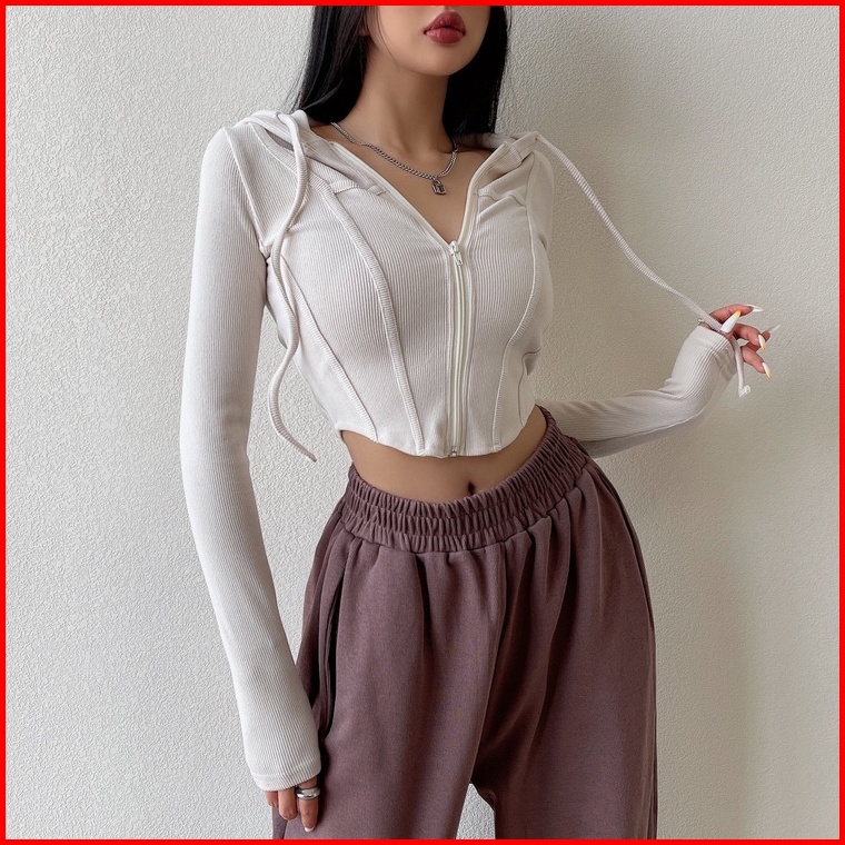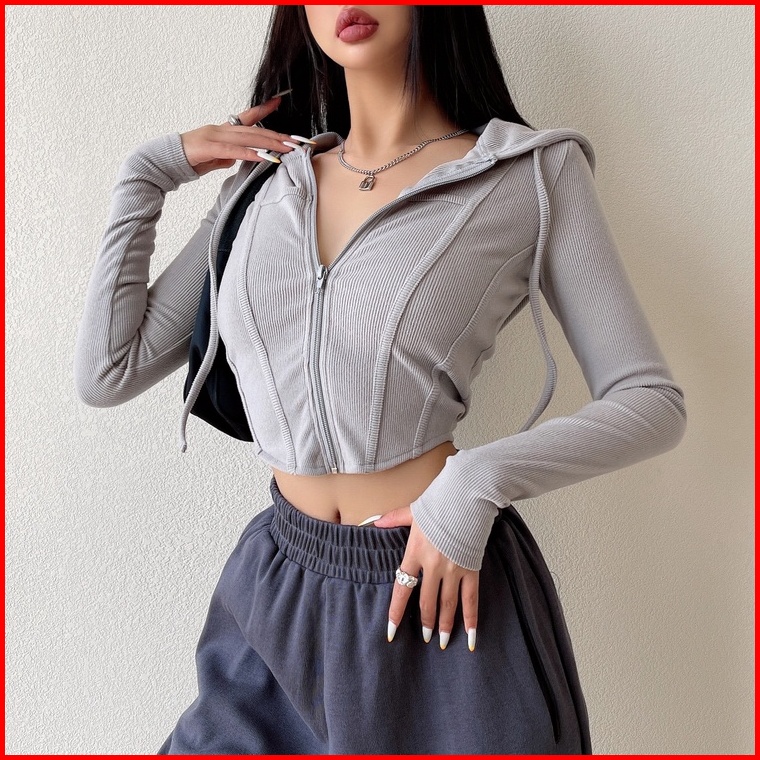 Premium Cropped Drawstring Full Zip Hoodie Sweatshirt 7444 S M L