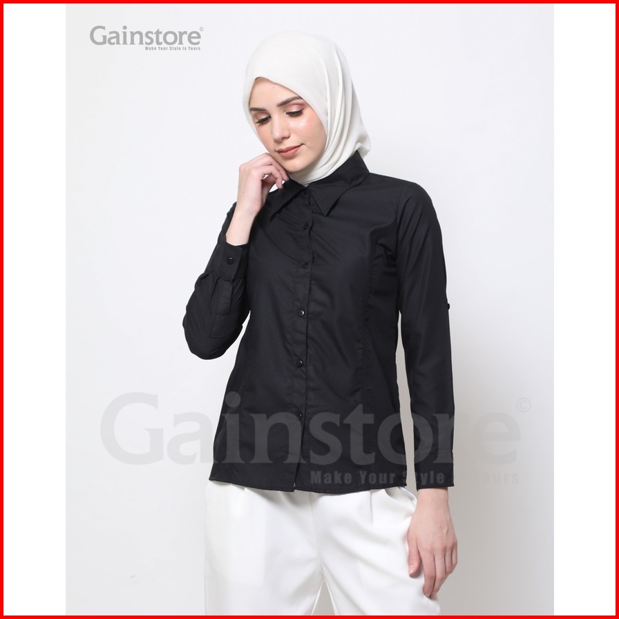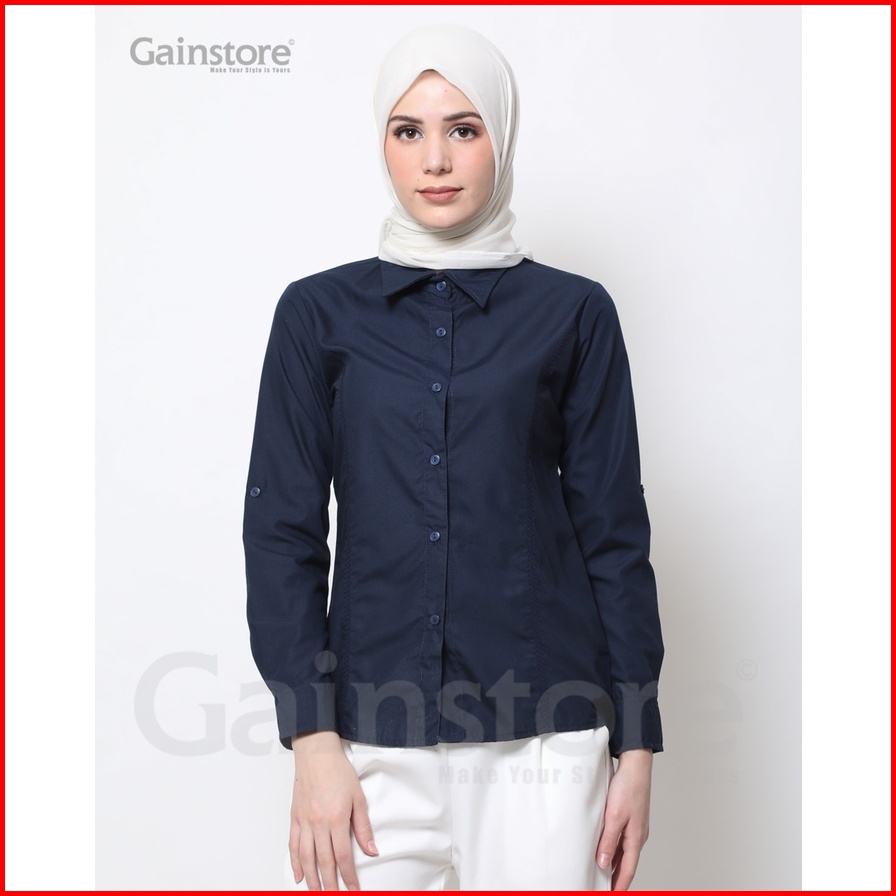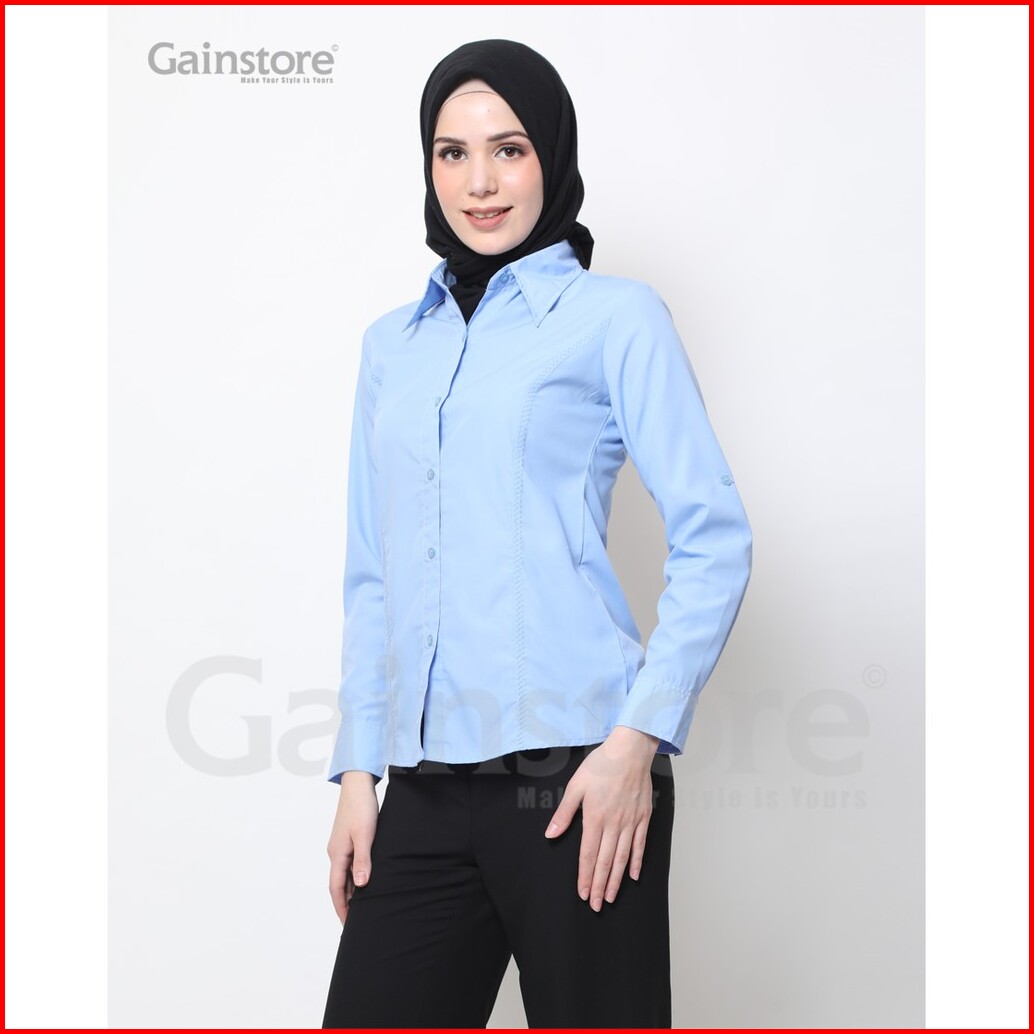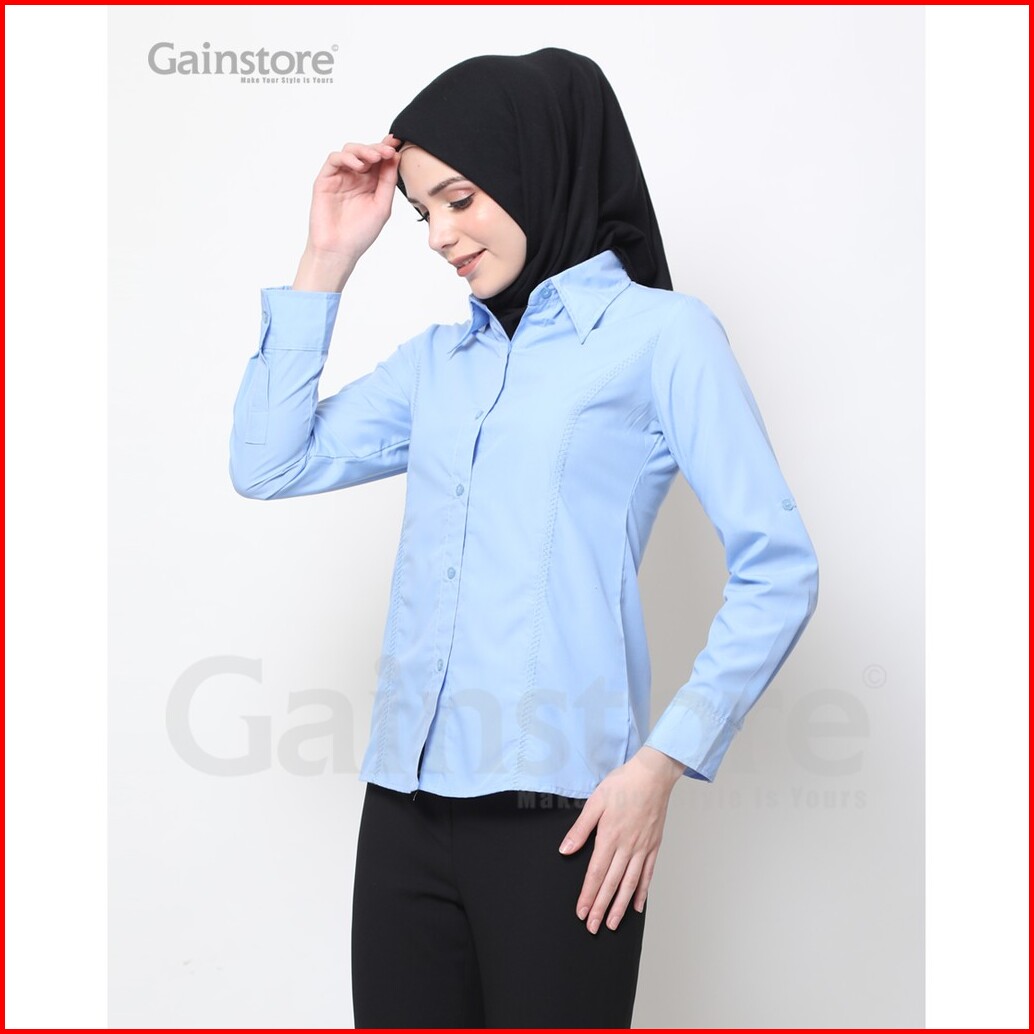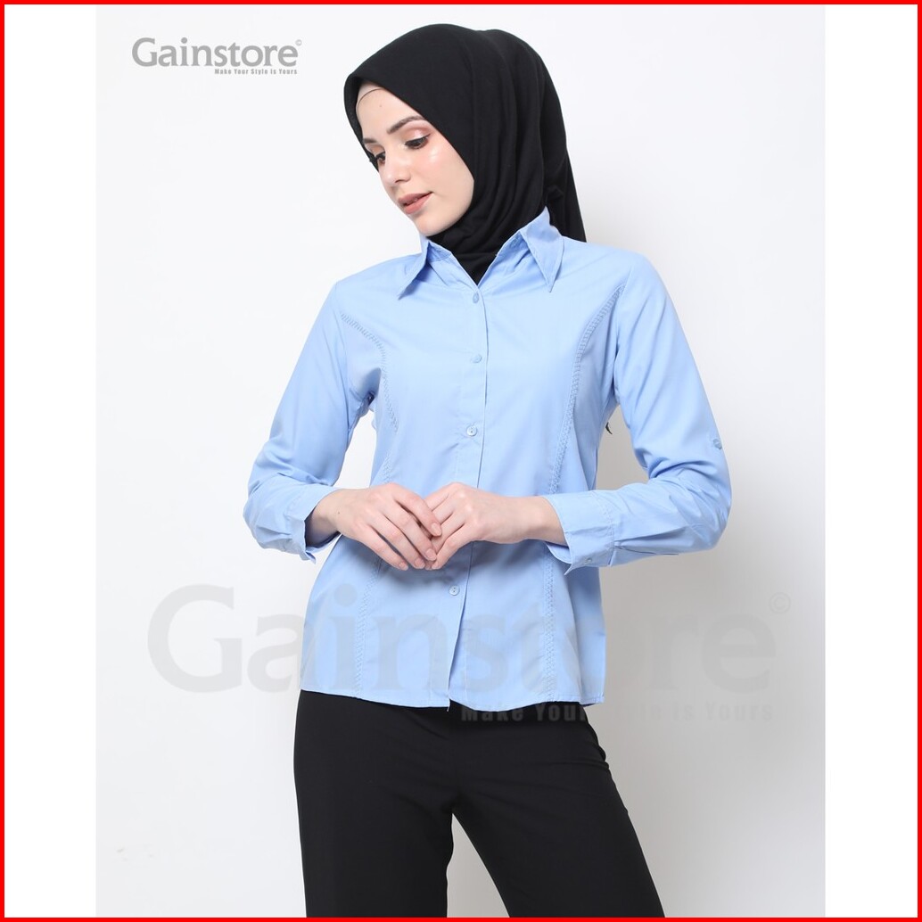 Kemeja Polos Wanita Baju Kantor Lengan Panjang Cewek Formal Atasan Casual - Blue