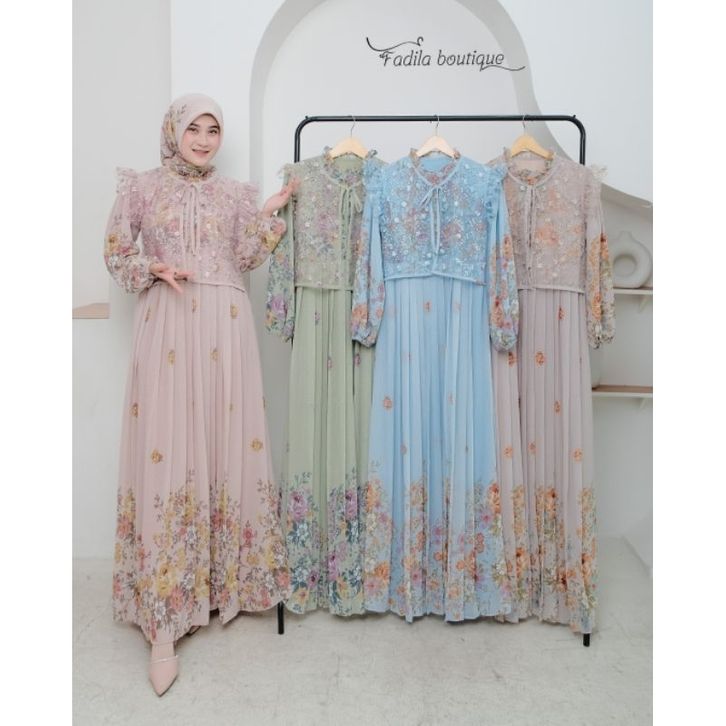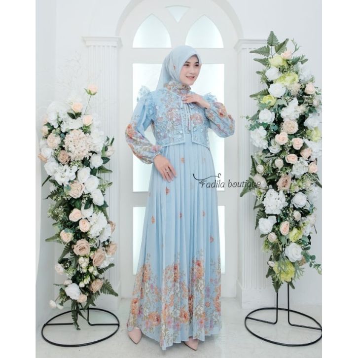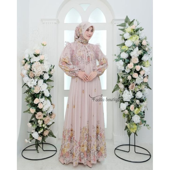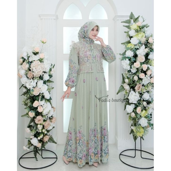 Dress Wanita Korea Mulim Kekinian Set Hijab Segiempat Maura Dress Ceruty Printing Mix Burkat Tile