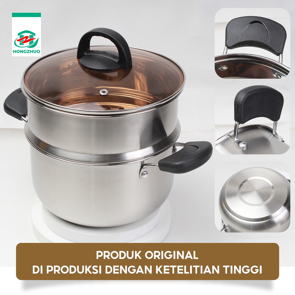 Hongzhuo Panci Kukus Steam Pot 2 Tingkat Full Stainless Steel 22cm Tutup Kaca
