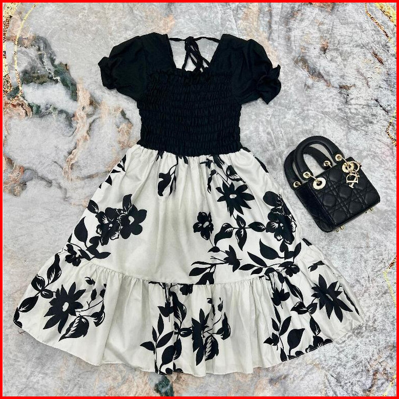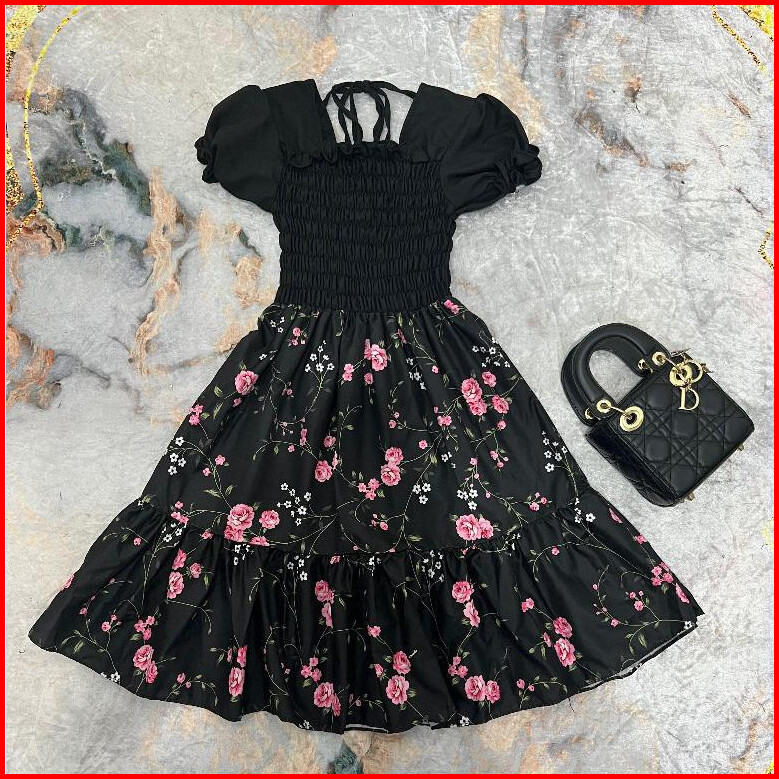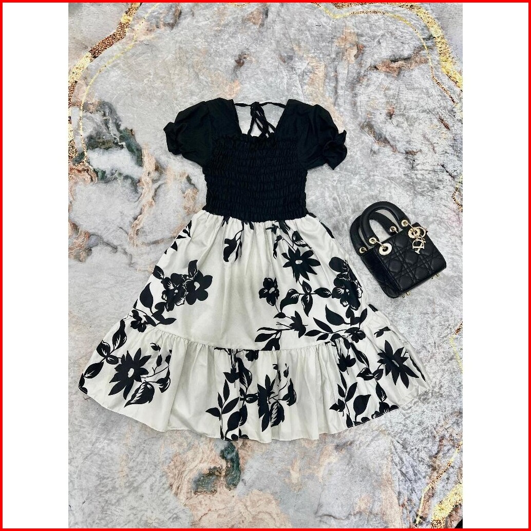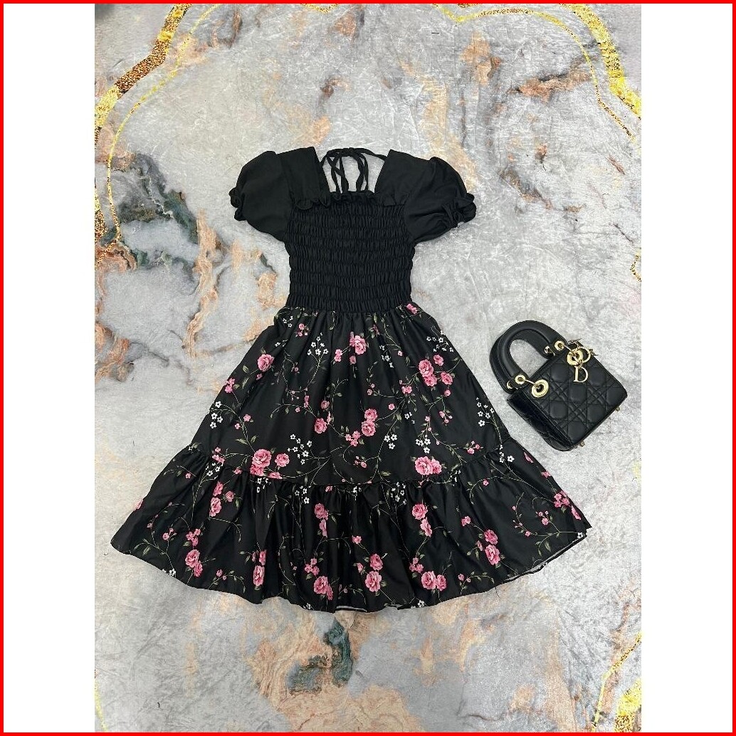 Kielo - Baju Dress Anak Perempuan Jiwon Dress Anak Combinasi Motif Flower Smock Dress Tali Belakang Gaun Anak Lucu Motif