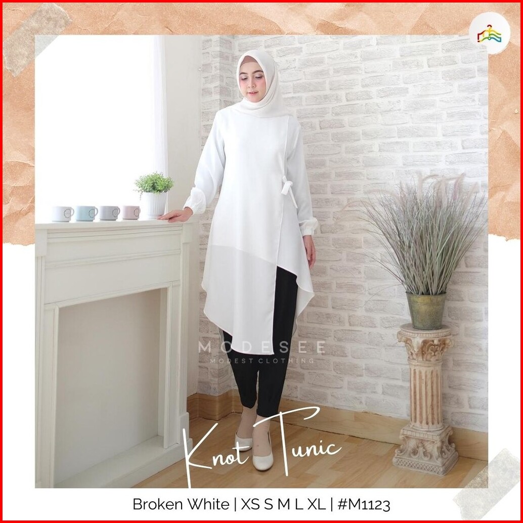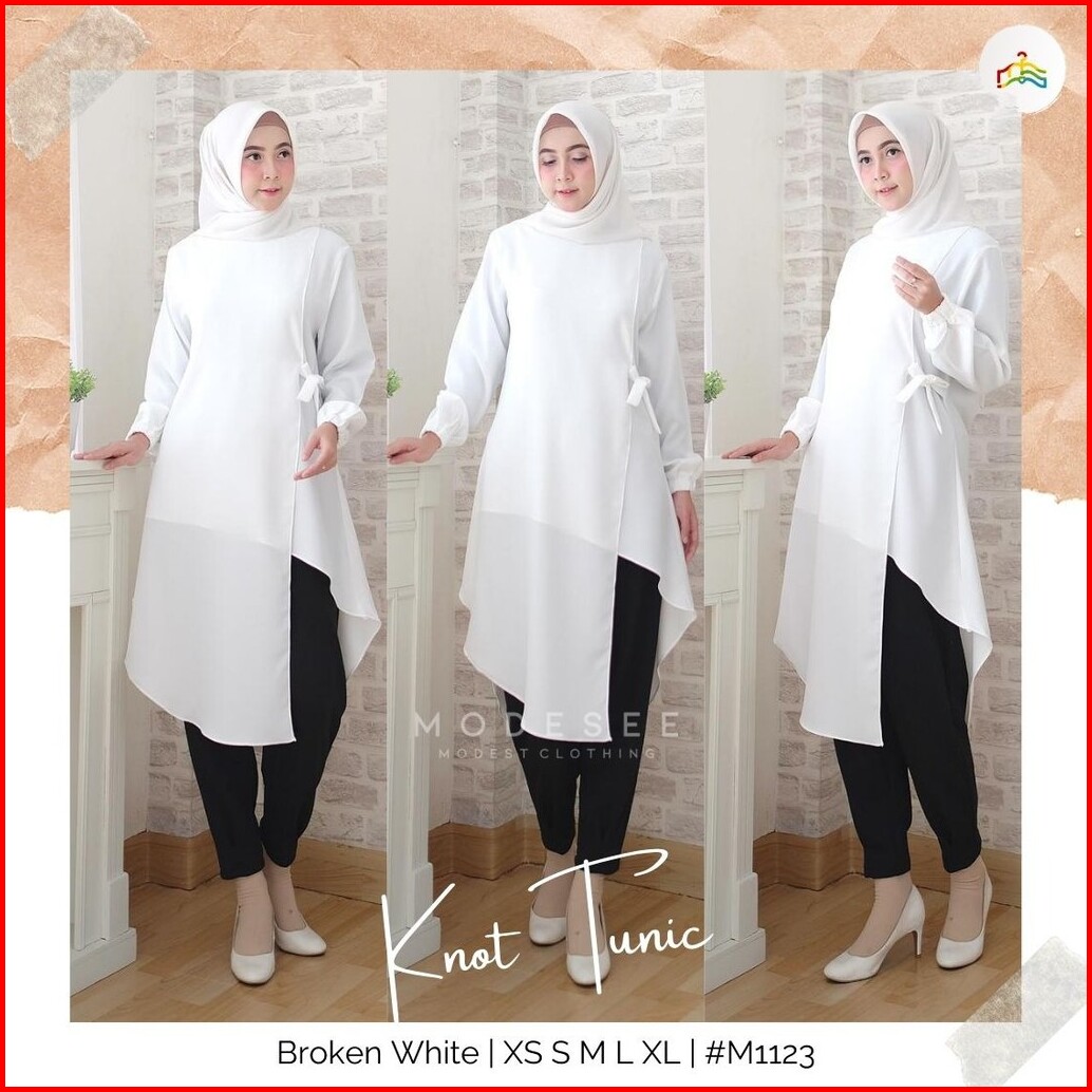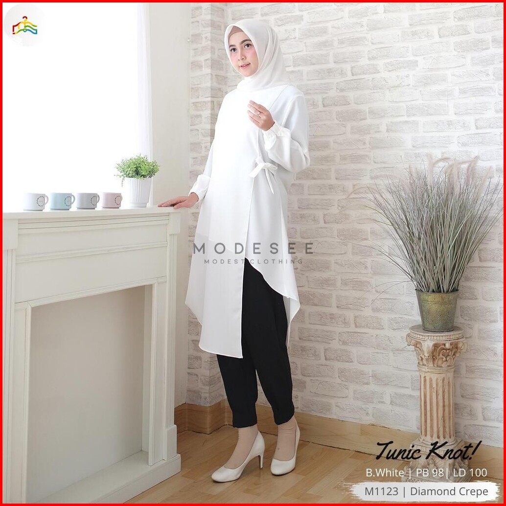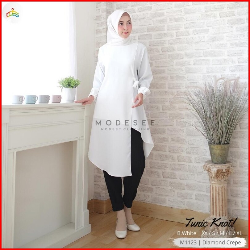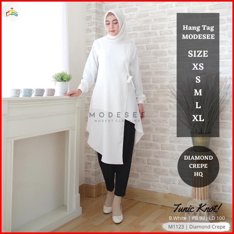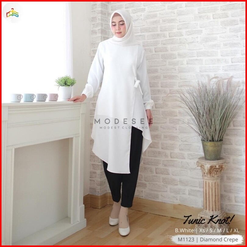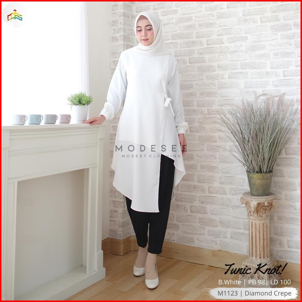 Modesee Tunik Putih Polos Wanita Muslim Tunik Ikat Knot Diamond M1123 Atasan Polos Atasan Putih