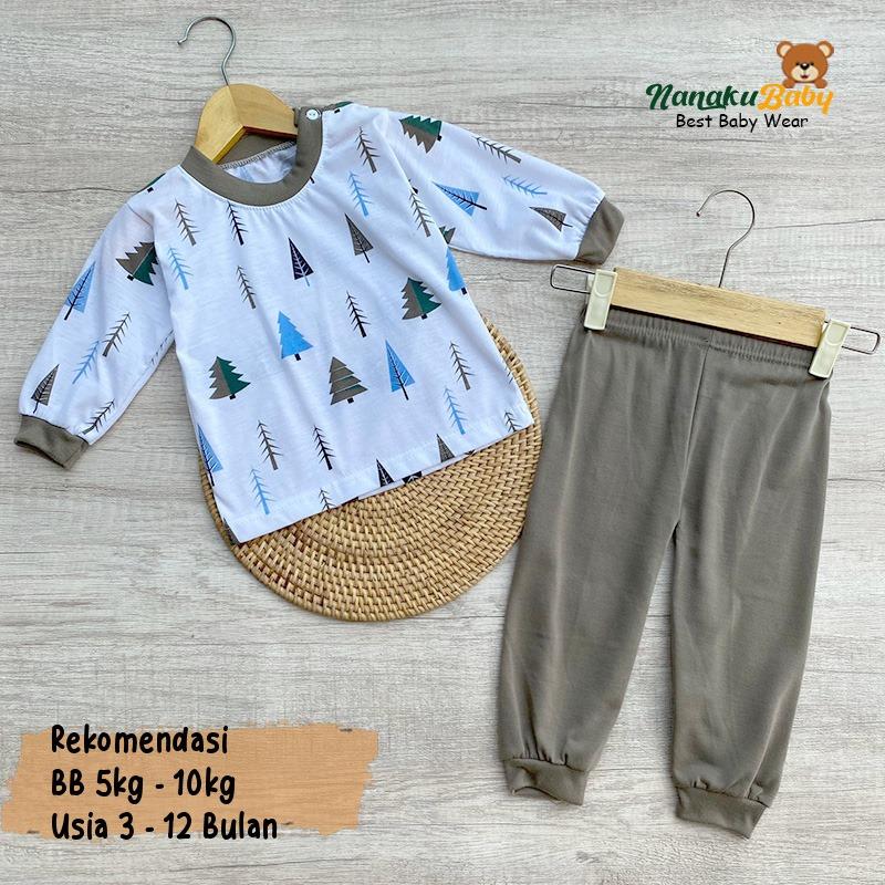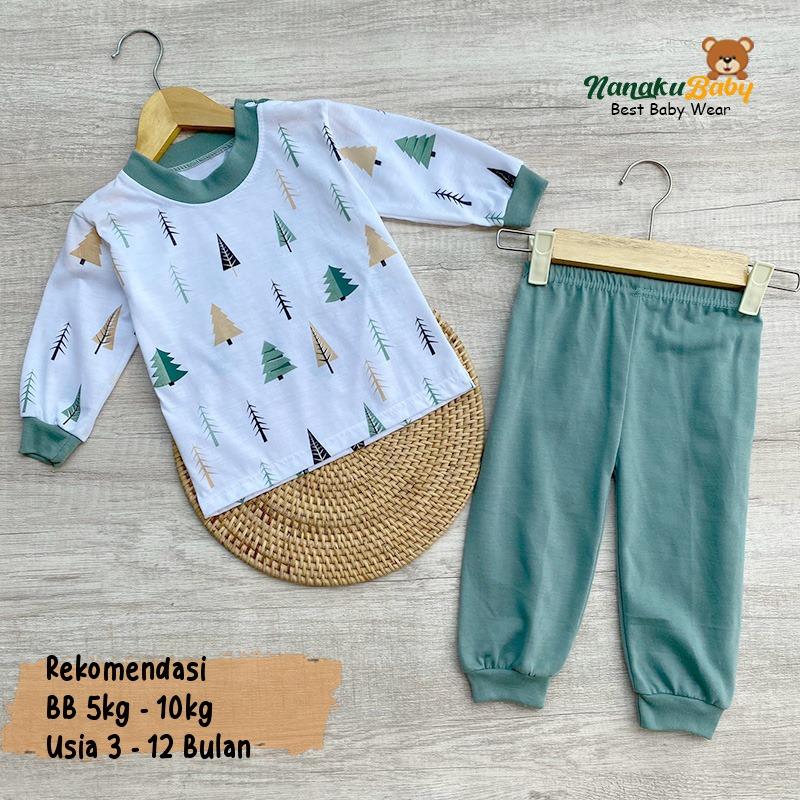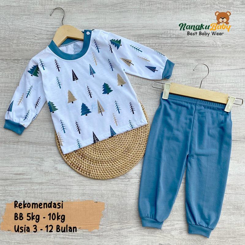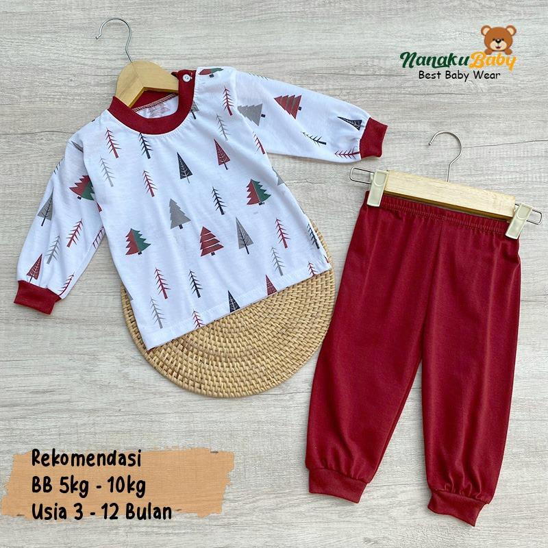 Nanaku Baby - Setelan Baju Bayi Lengan Panjang Kancing Pundak One Set Piyama Motif Fir Tree Usia 3-12 Bulan