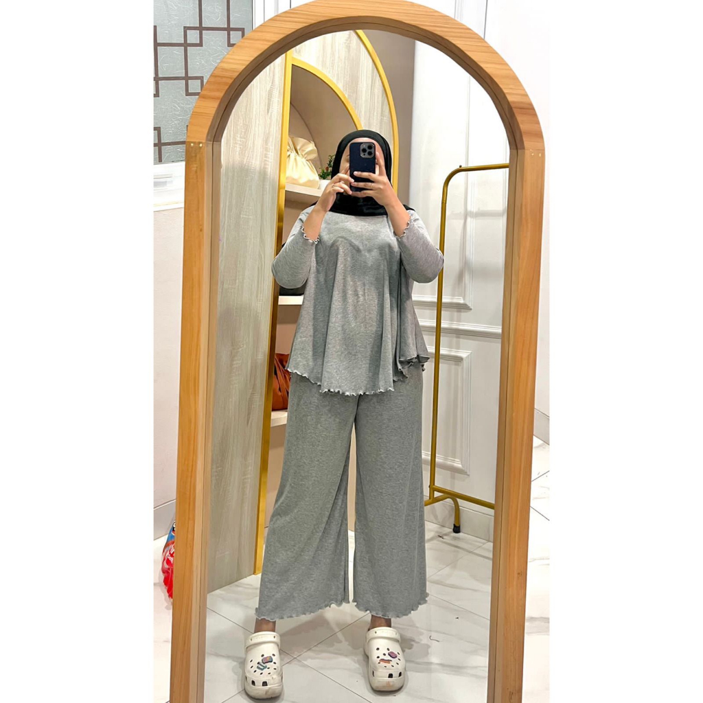 Atachi Setelan Rib Knit Wanita Lengan 7/8 Celana Panjang Baju Atasan Setelan Wanita Dewasa Polos Denacollection