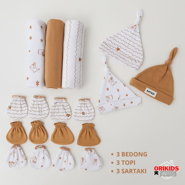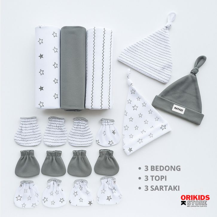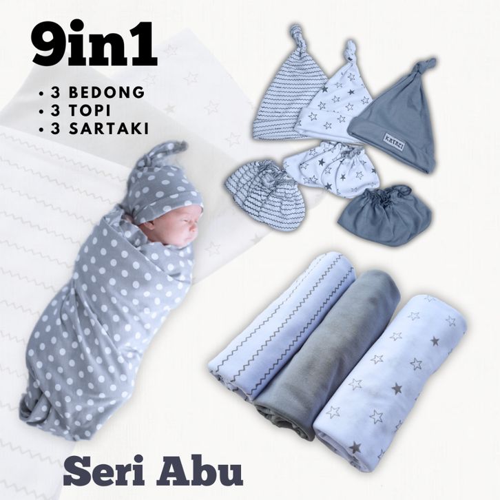 9in1 Paket 3 Bedong Sartaki Kupluk Bayi Baru Lahir Seri Abu