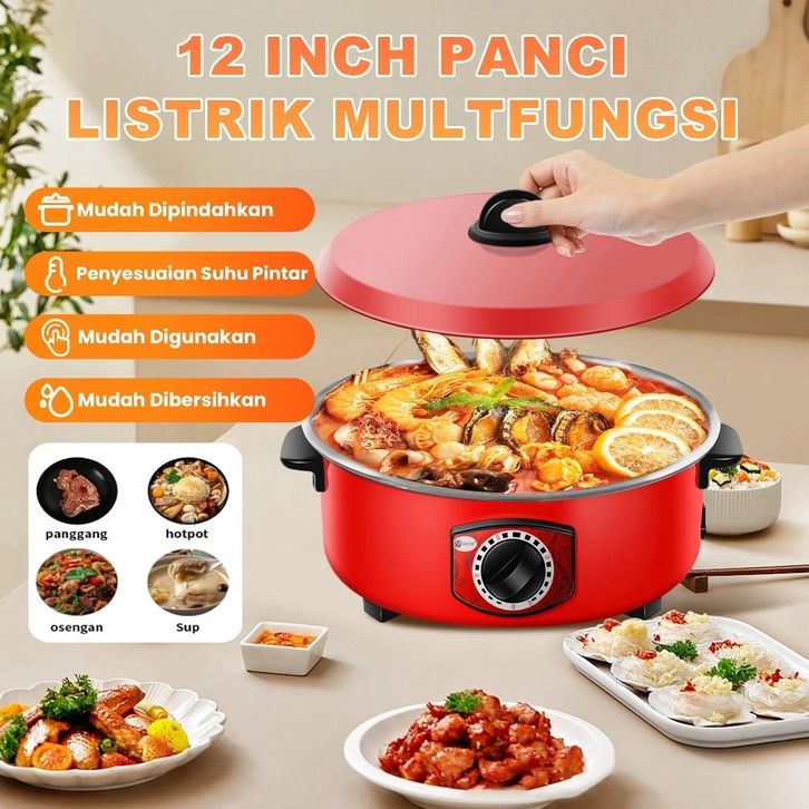 12 inch Panci Listrik Multifungsi Wajan Listrik Besar Jumbo Serbaguna Anti Lengket 3 in 1 Teflon