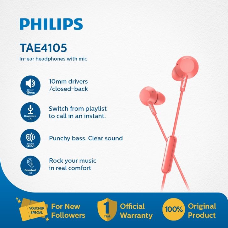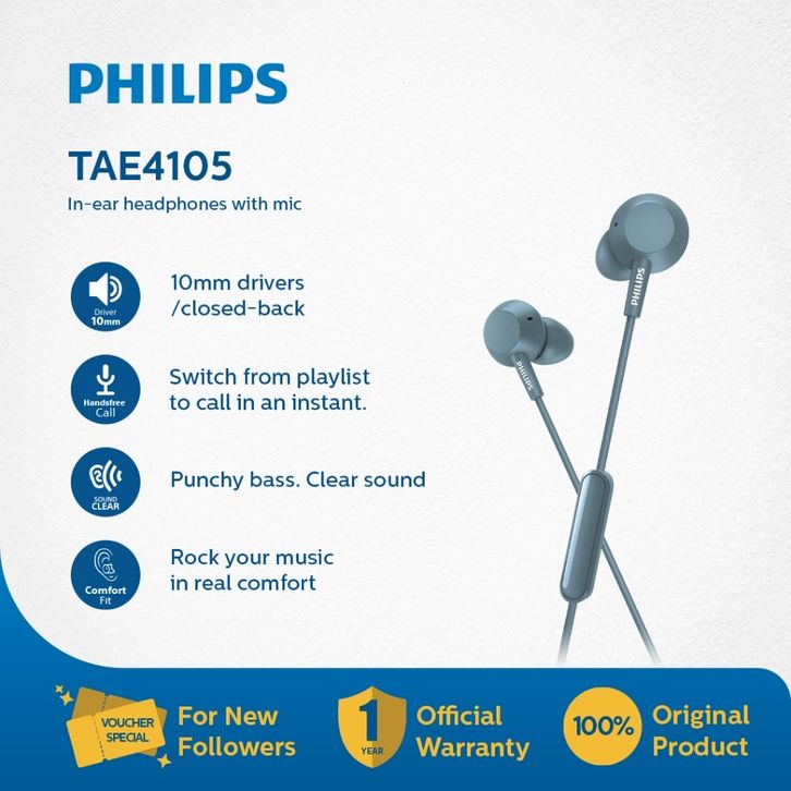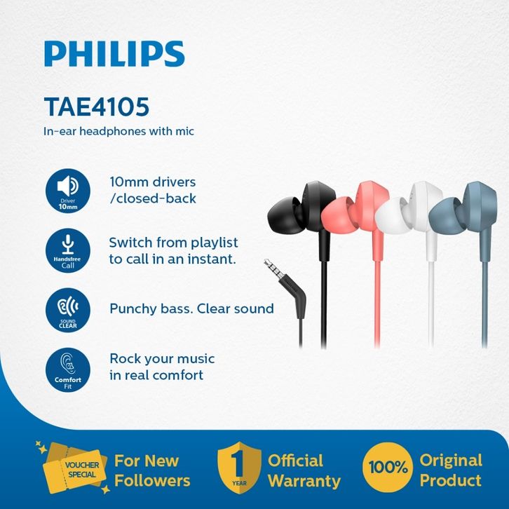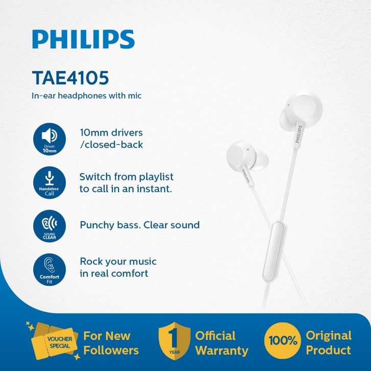 HEADPHONE PHILIPS TAE4105 IN-EAR HEADPHONES BASS WITH MIC TAE 4105 HEADSET BLUETHOOH ORI MURAH