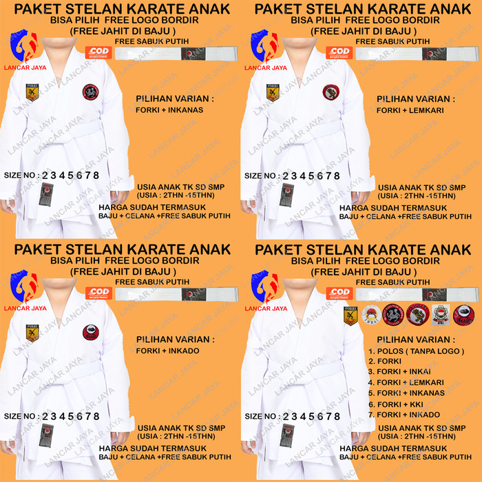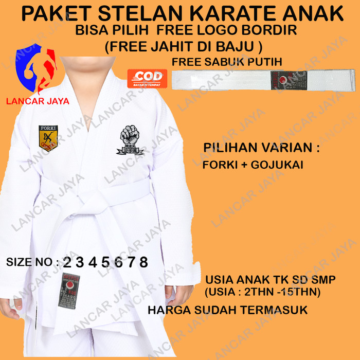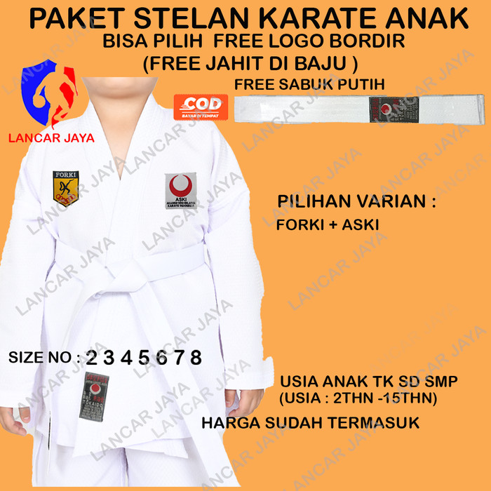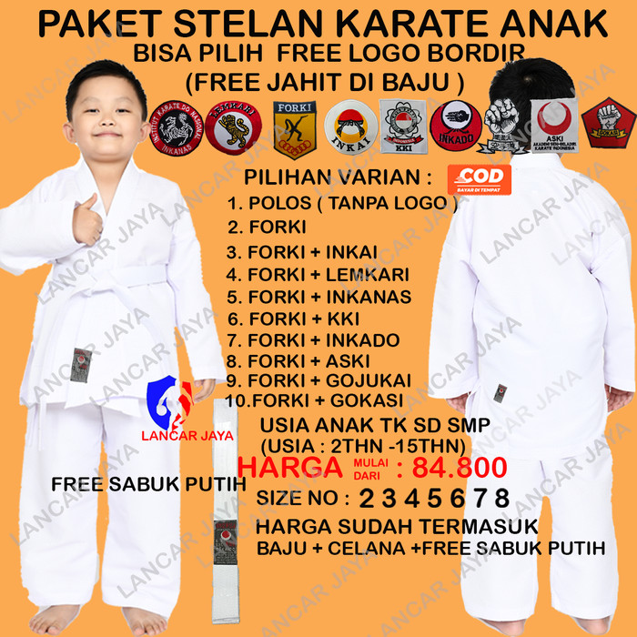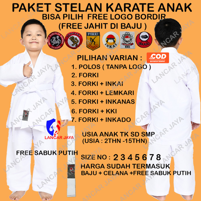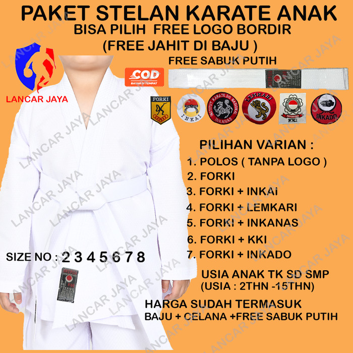 BAJU KARATE ANAK FREE LOGO( BEBAS PILIH ) + SABUK PUTIH -1 STEL - POLOS, SIZE NO 6
