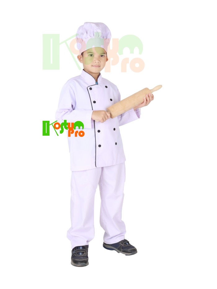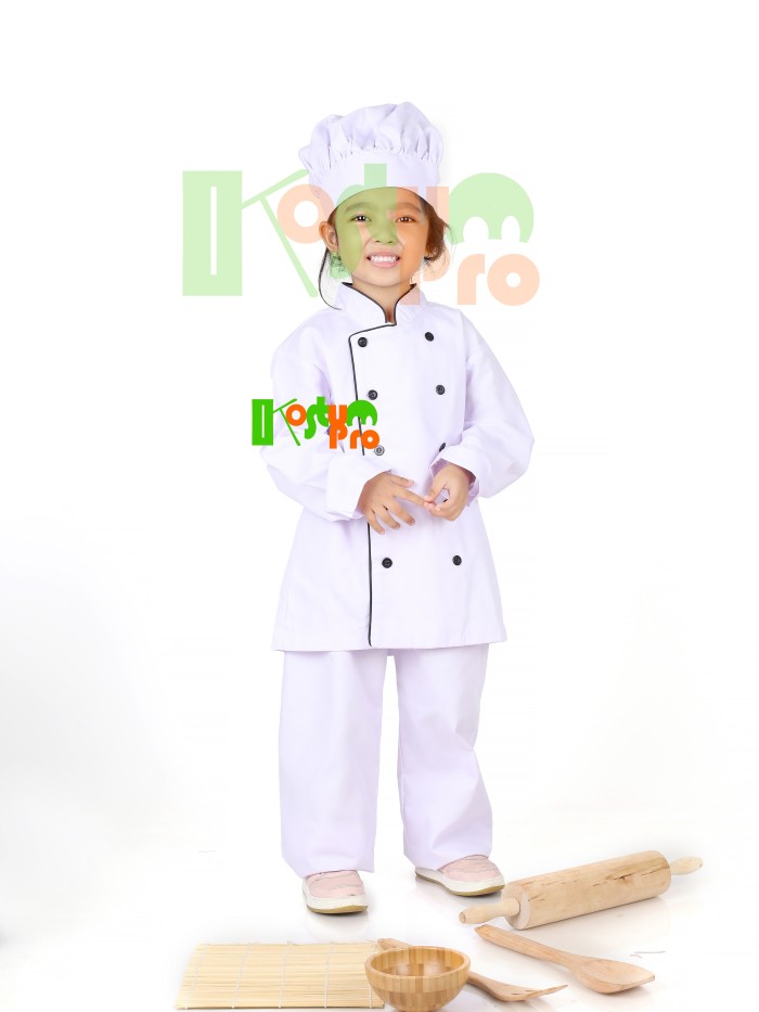 KOSTUM BAJU KOKI ANAK LENGKAP UK 8 (8-9 TAHUN) /TANGAN PANJANG/PUTIH - 5-6 TAHUN