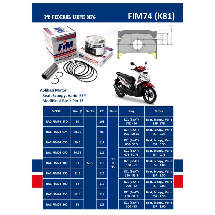 FIM74 PISTON KIT New Beat, Scoppy, Vario ESP