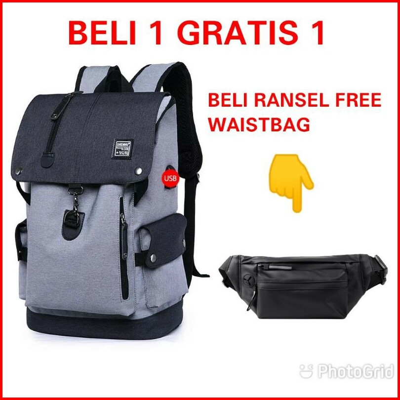 Js Buy 1 Get 1 - Tas Ransel Pria Beli Ransel Punggung Backpack Cowok Free Waistbag