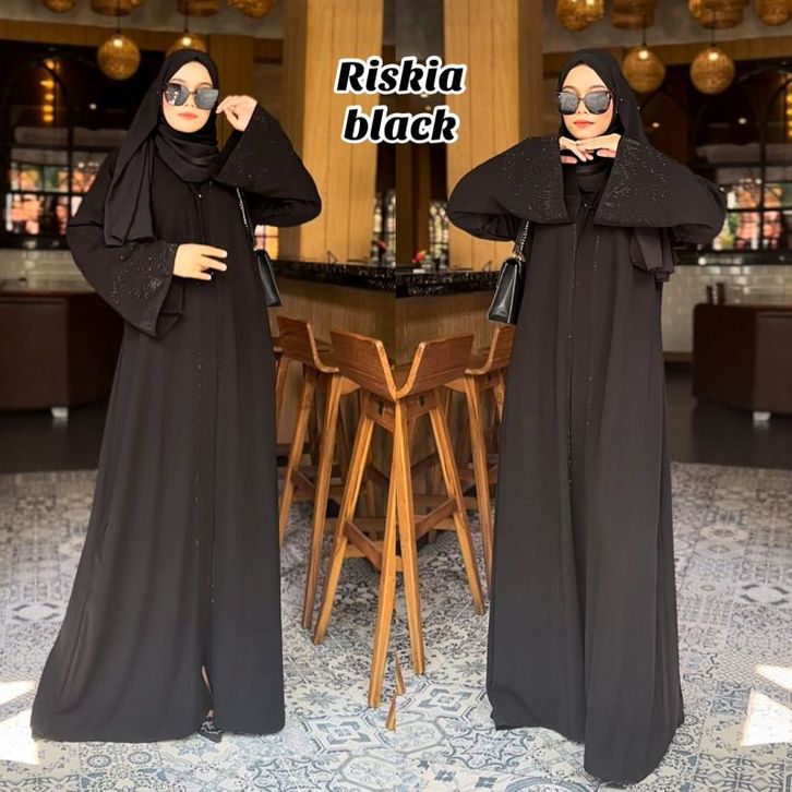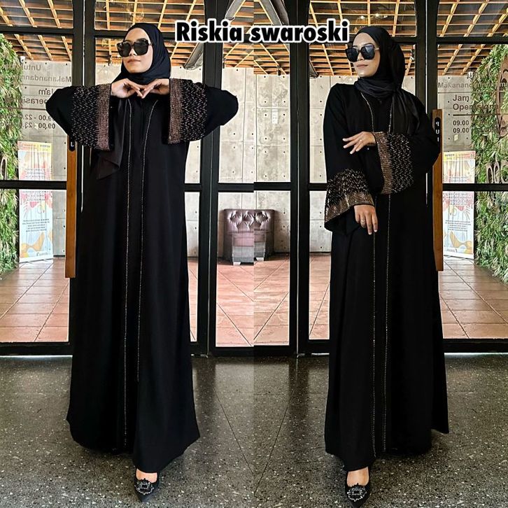 Abaya Hitam Riskia Swaroski Gamis Dubai Mewah Elegant Dress Pesta Muslimah Busana Jalabia Kekinian Murah