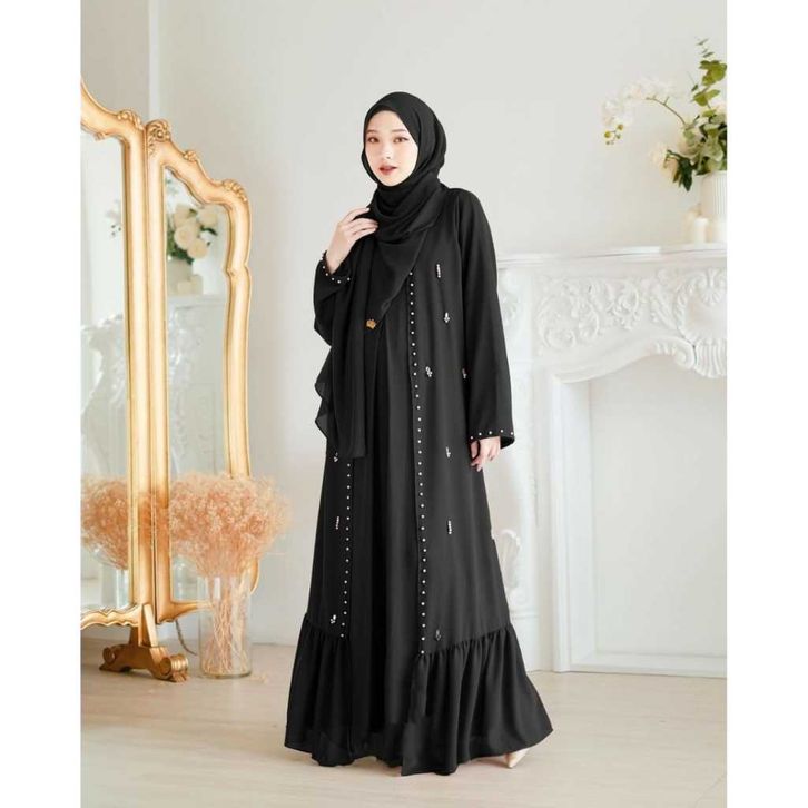 New Abaya Hitam Turkey Inner + Outer Gamis Syari Kaftan Mewah Elegan Bahan Ceruty Babydoll