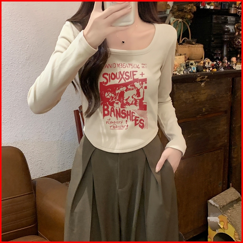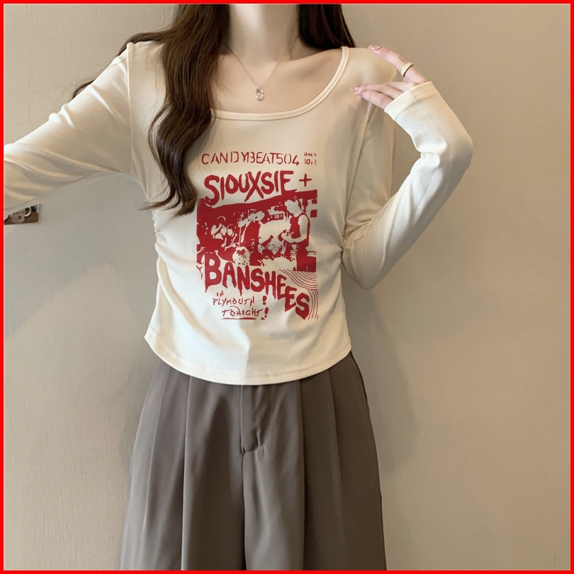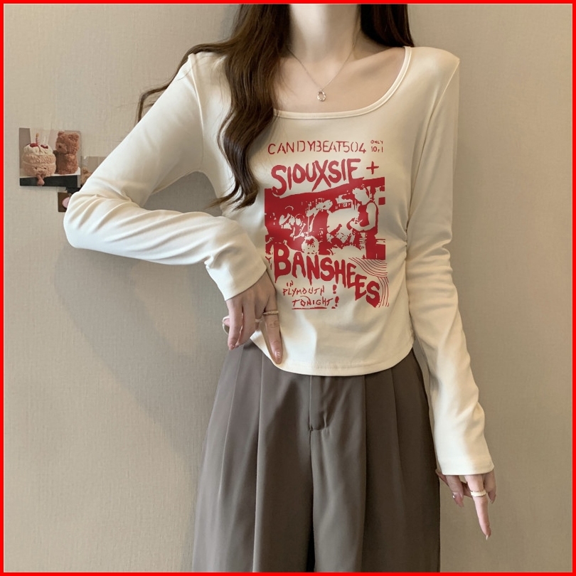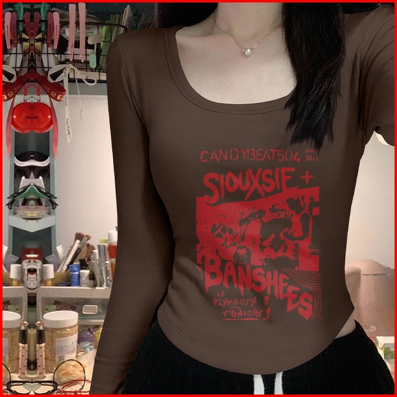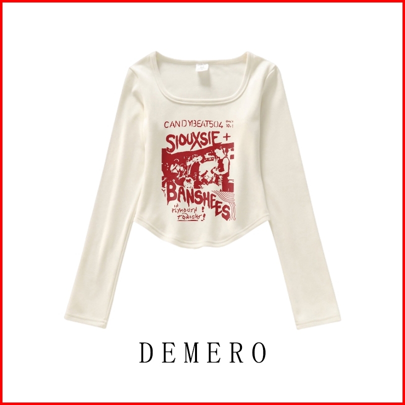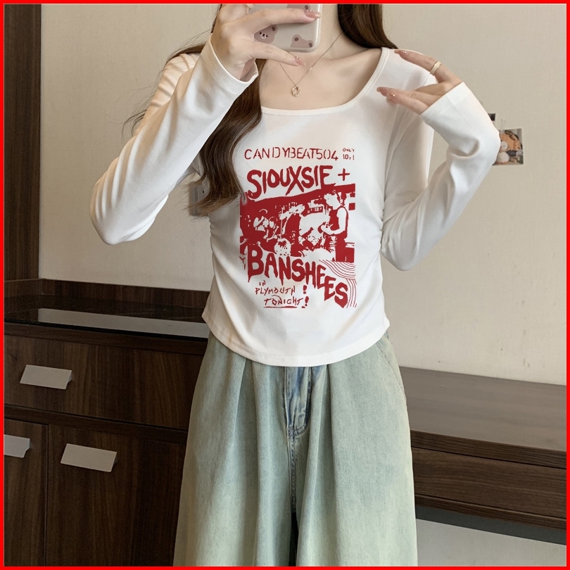 Demero Baju Atasan Wanita Terbaru Korean Style Cetak Kembali Banshees Crop Top Lengan Panjang Cashmere Baju Kaos Wanita