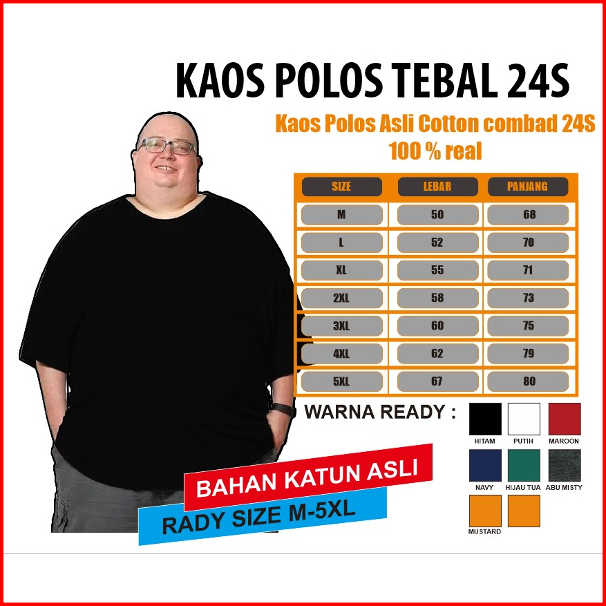 Kaos Polos Size M - 5xl Combad 24s Tebal Asli Catton Bukan Bahan Pe Atau Semi Katun Garansi 100