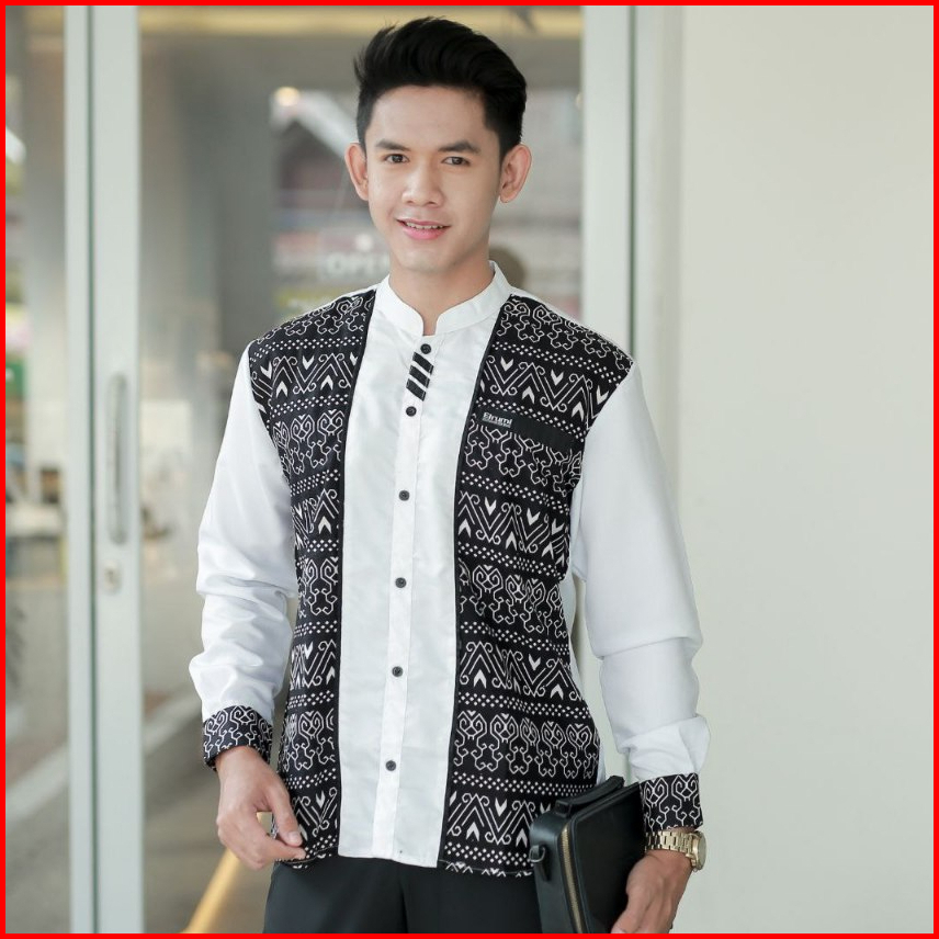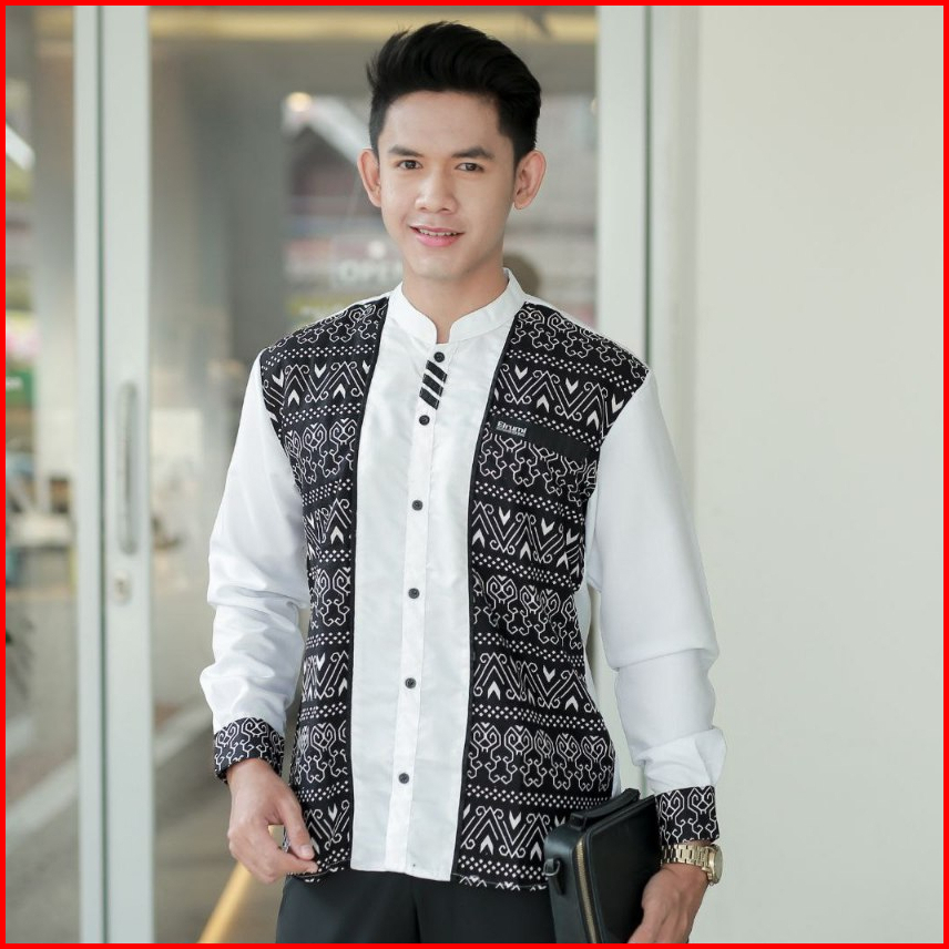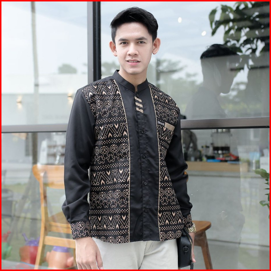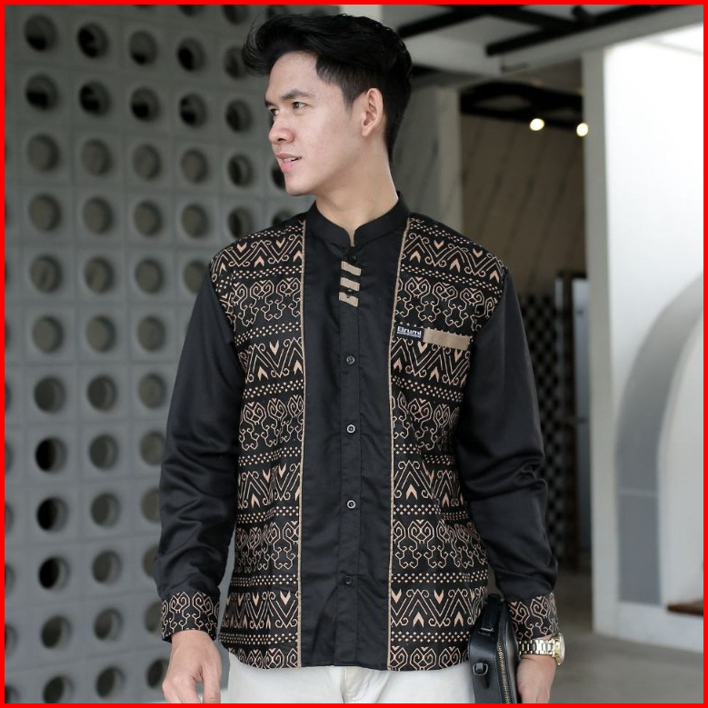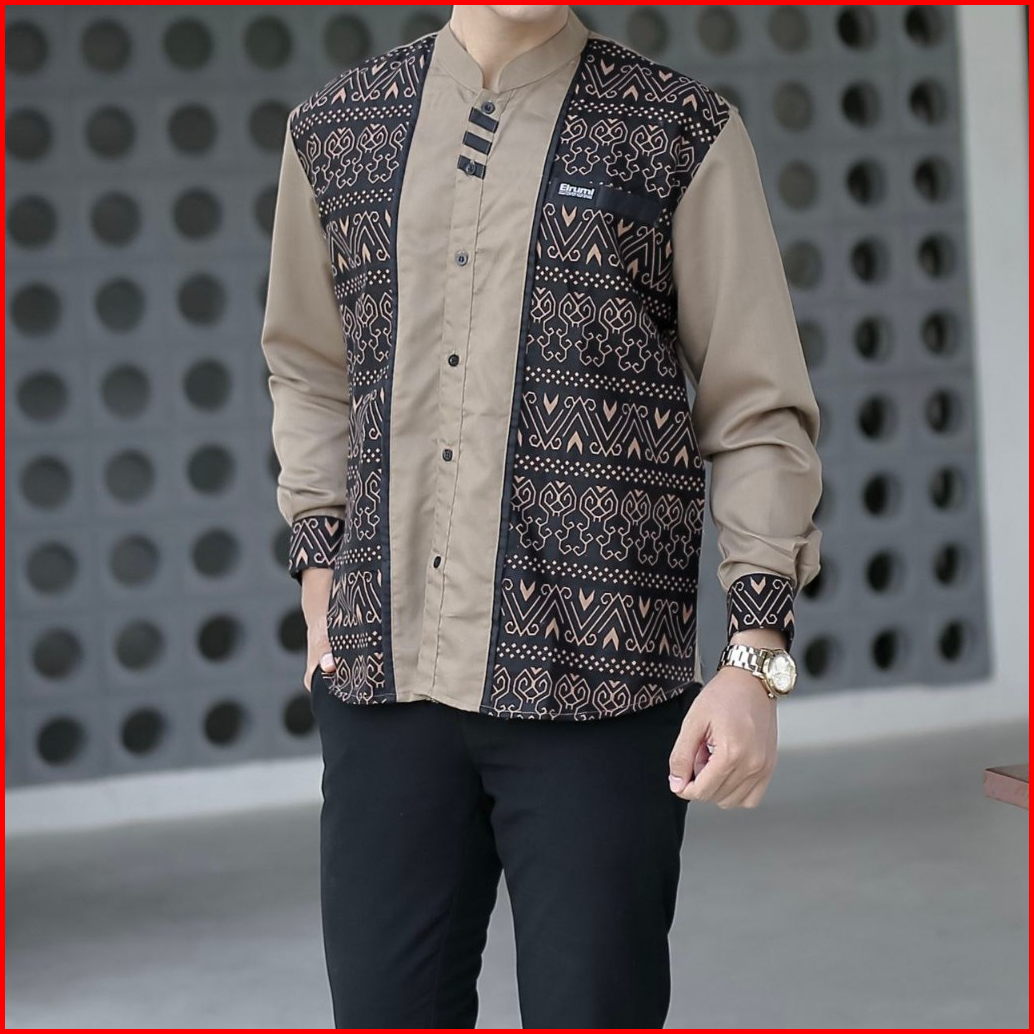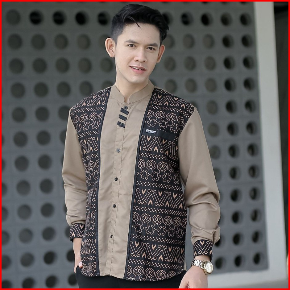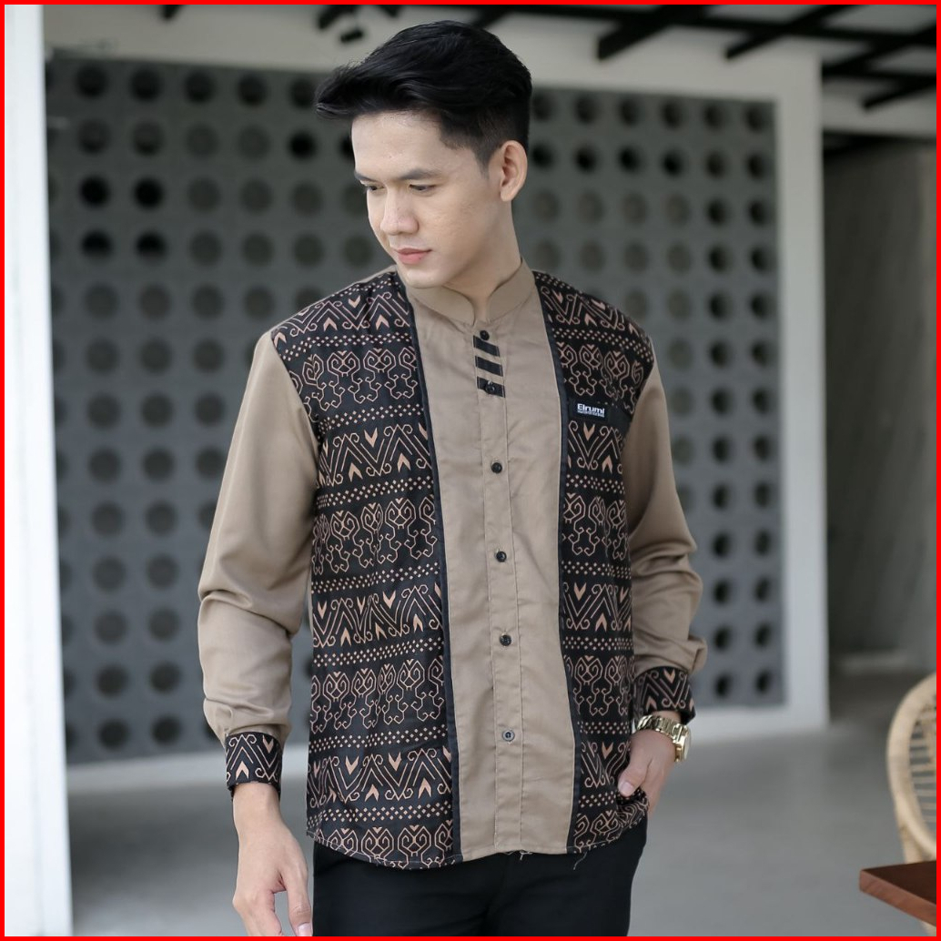 Baju Kemeja Koko Pria Lengan Panjang Elrumi Motif Jarilist Kombinasi Batik Warna Cokelat