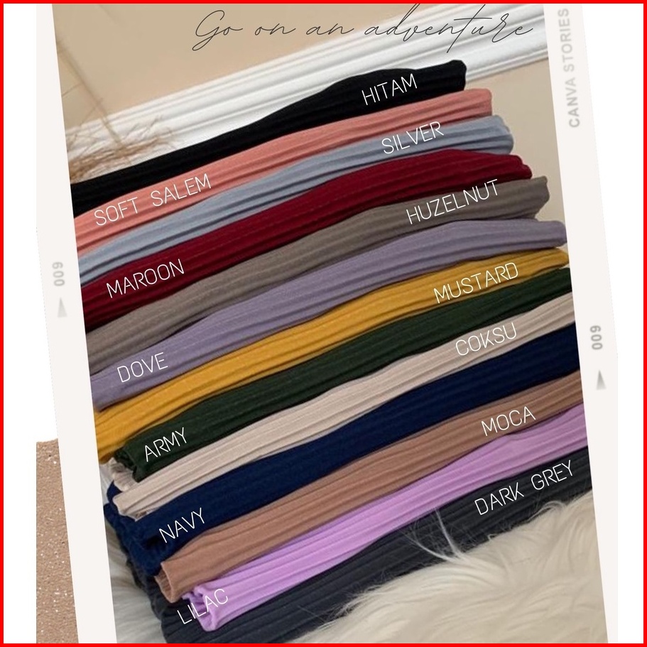 Hitam, Navy, Maroon, Abu Tua, Silver, Moca, Coksu, Hijau Tua, Soft Salem, Mustard, Dove, Hazelnut, Lilac, Dusty Rose, Hijau Wardah, Sage Green, Denim, Plum, Lavender, Khaki, Coffe, Broken White, Teracotta, Olive, Pink DW, Cream, Vanhouten