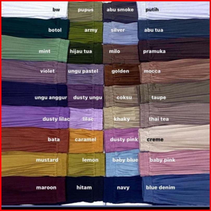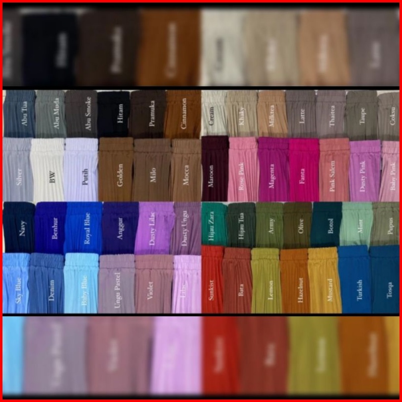 Hitam, Putih, Broken white, Coksu, Babyblue, Babypink, Navy, Maroon, Merah, Fanta, Magenta, Mustard, Army, Abusmoke, Silver, Abumuda, Pramuka, Mocca, Milo, Mint, Hijau botol, Cream, Cinnamon, Khaky, Dustylilac, Dustyungu, Lilac, Benhur, Denim, Sunkist, Bata, Lemon, Turkish, Tosca, Skyblue, Hijau zara, Hijau tua, Olive, Hijaupupus, Pink salem, Dustypink, Rosepink, Ungu anggur, Taupe, Hazelnut, Thaitea, Violet, Almond, Abutua, Ash grey, Ungu pastel, Pink pastel, Milktea, Goldenbrown, Aqua