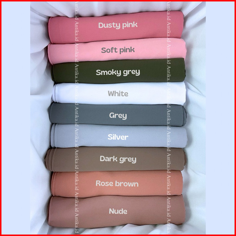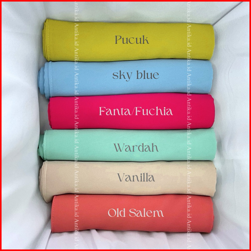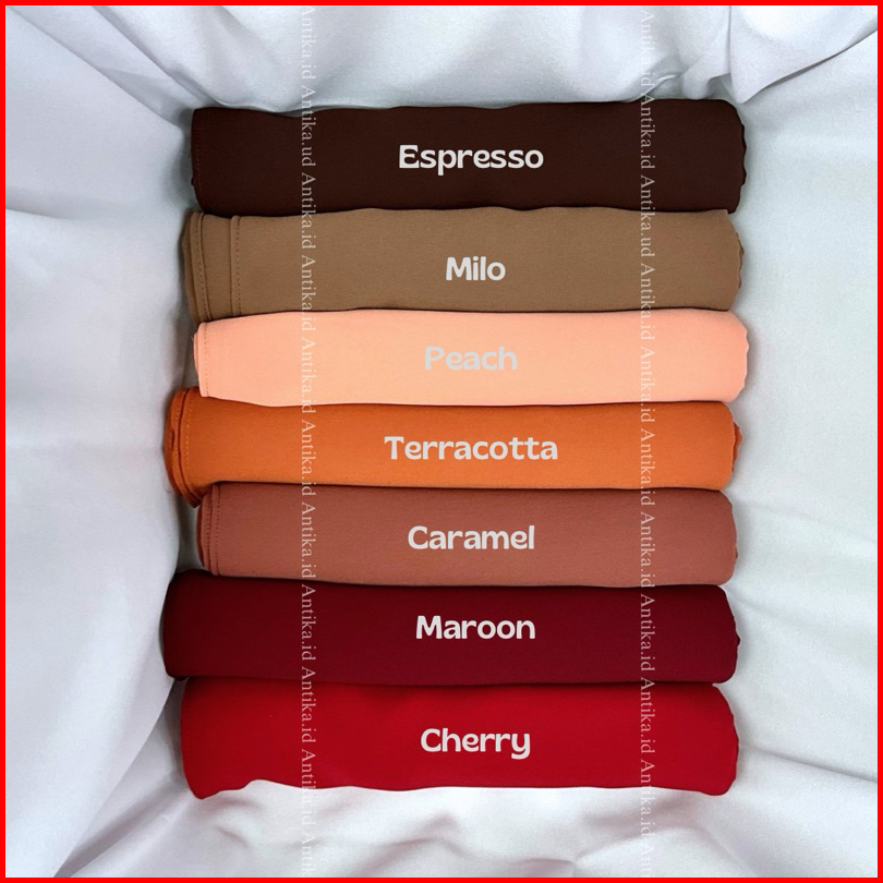 Hitam, Navy, Smoky grey, Dark grey, Putih tulang, White, Maroon, Army, Baby violet, Choco milk / coksu, Cream, Khaky, Cherry, Taro, Caramel, Pucuk, Dusty pink, Denim, Dusty purple, Lavender, Biru electrick, Fanta, Expreso, Greem bottle, Sky blue, Grey, Milo, Lilac, Lime, Mustard, Kubus, Melon, Sage / soft green, Mocca, Nude, Rose brown, Teracotta, Silver, Tosca, Wardah, Vanila, Purple, Peach, Deep army, Biru Wardah, Old Salem, Soft pink, Burgundy, Latte, Hazelnut, Coklat Mahogany