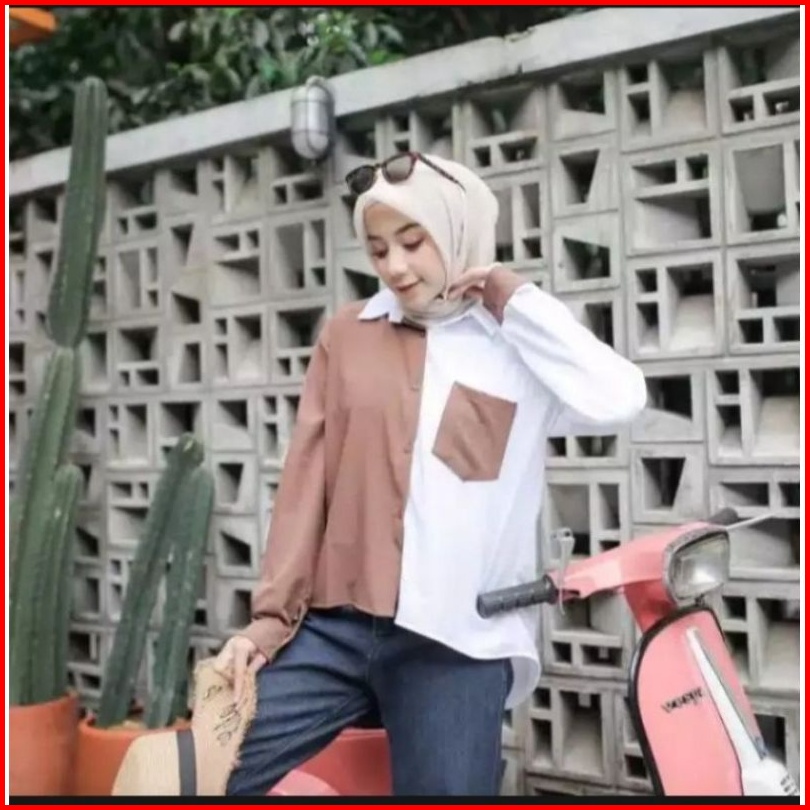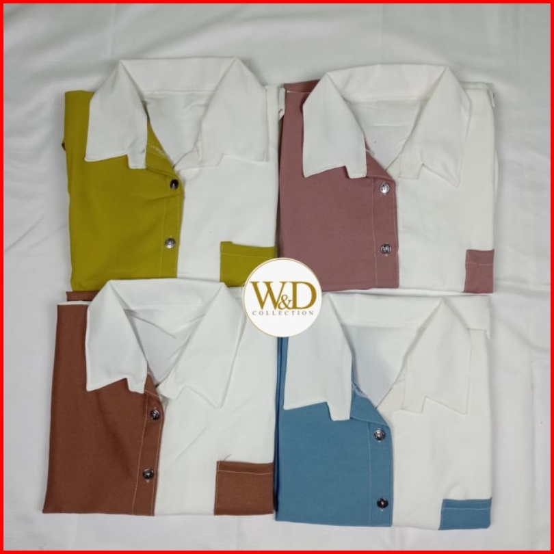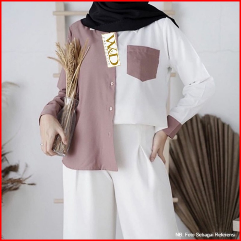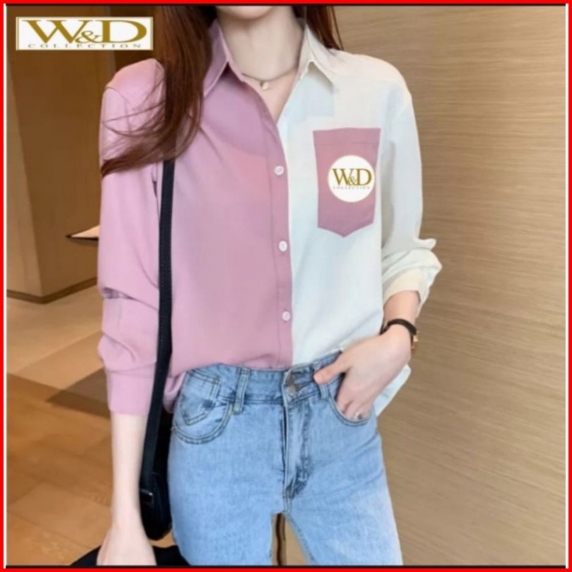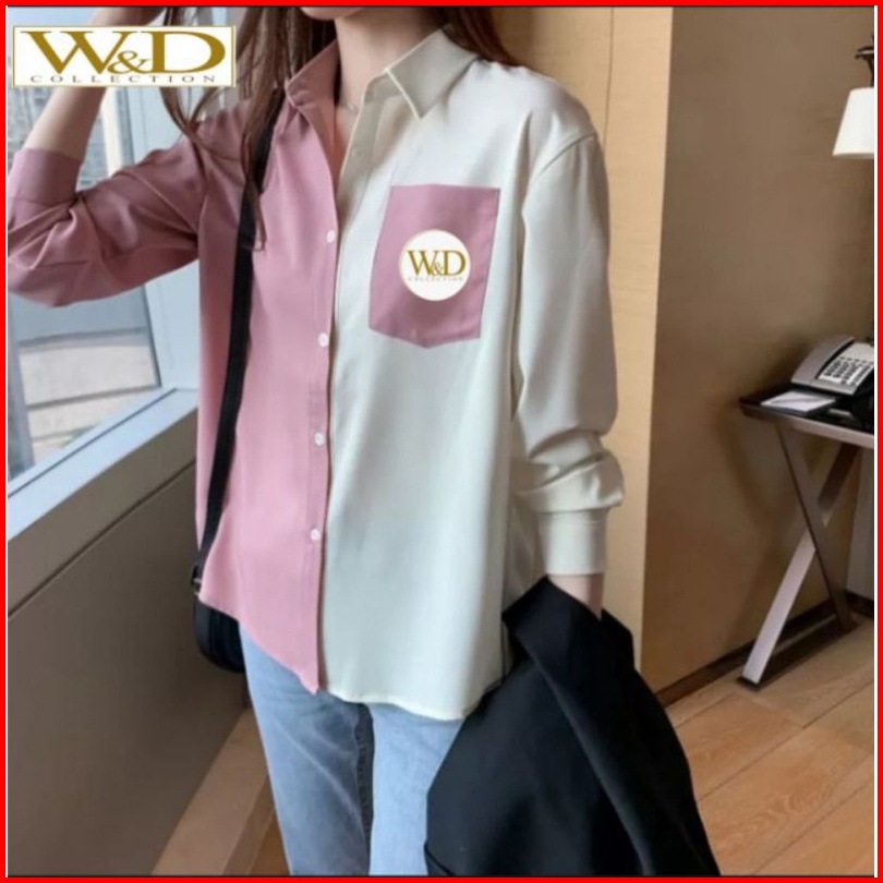 Kemeja Wanita Atasan Blouse Casual Polos Kombinasi Warna Lengan Panjang Baju Cewe Model Pinguin