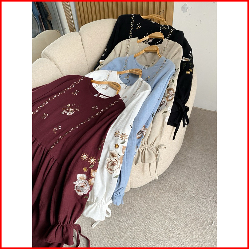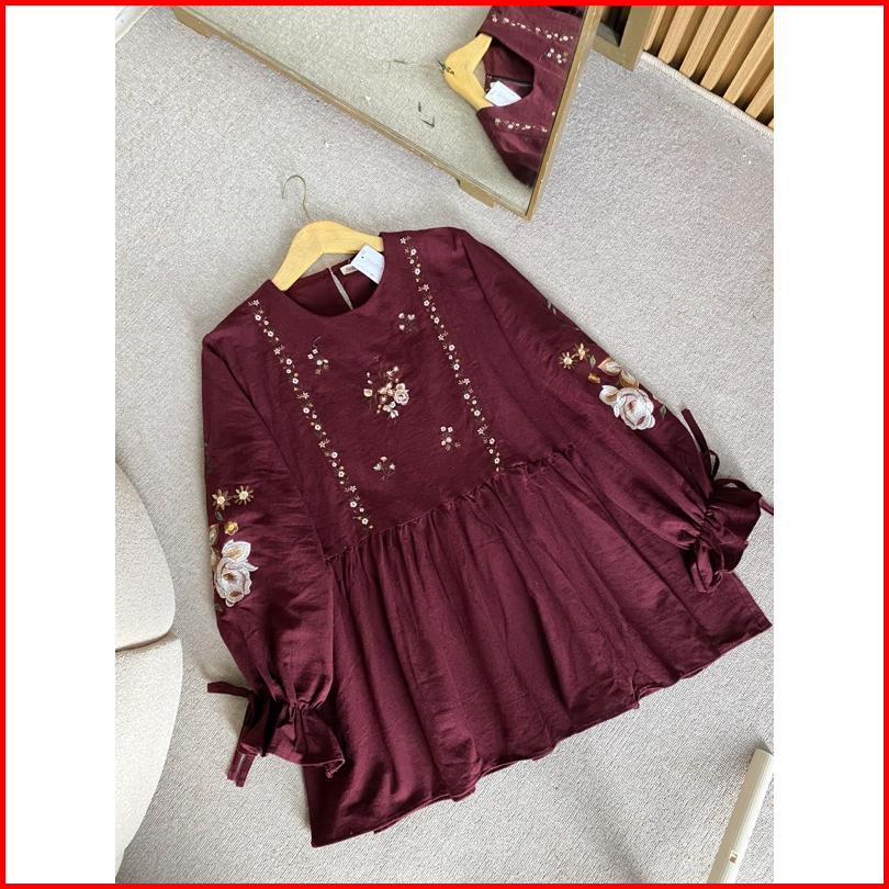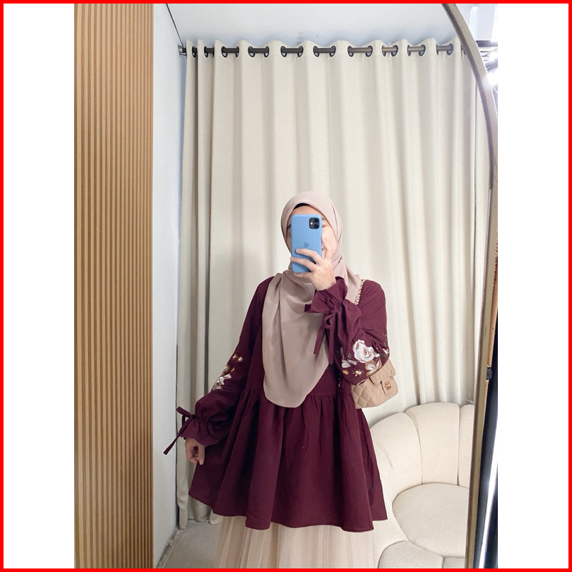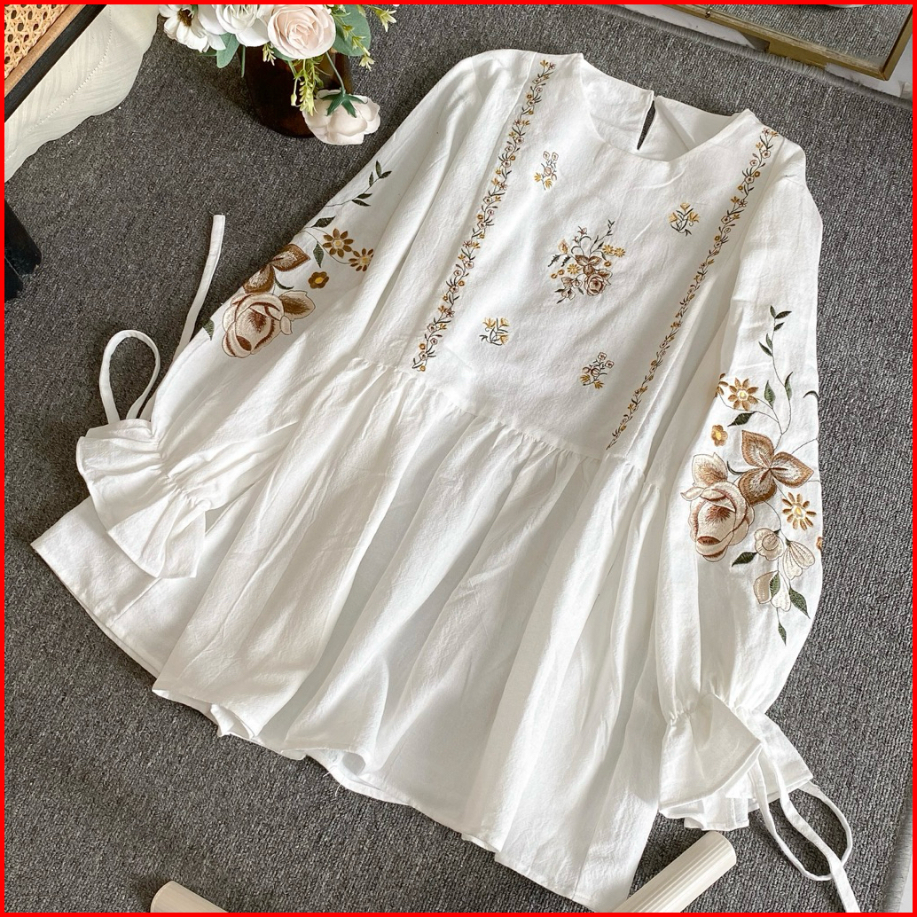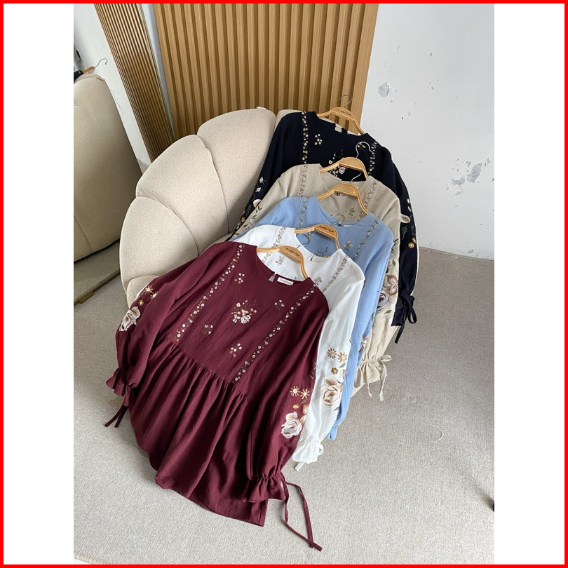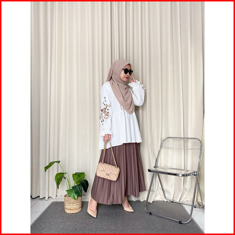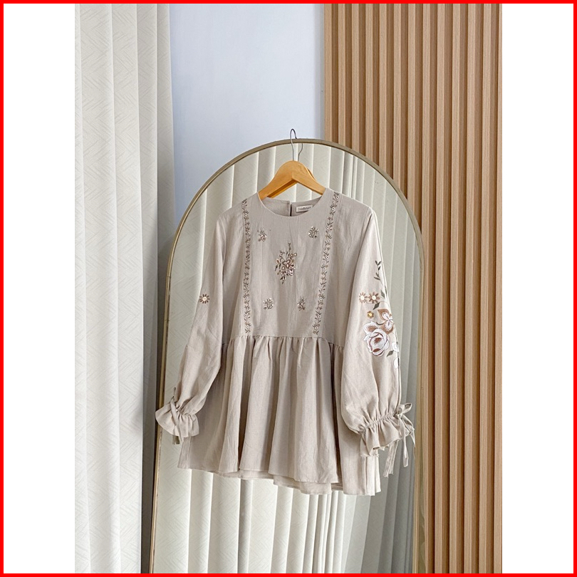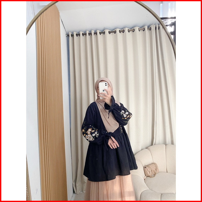 Jenara Embroidery Blouse Atasan Bordir Gemes Bunga Pita Putih Bw Denim Hitam Mocca Linen Kerja