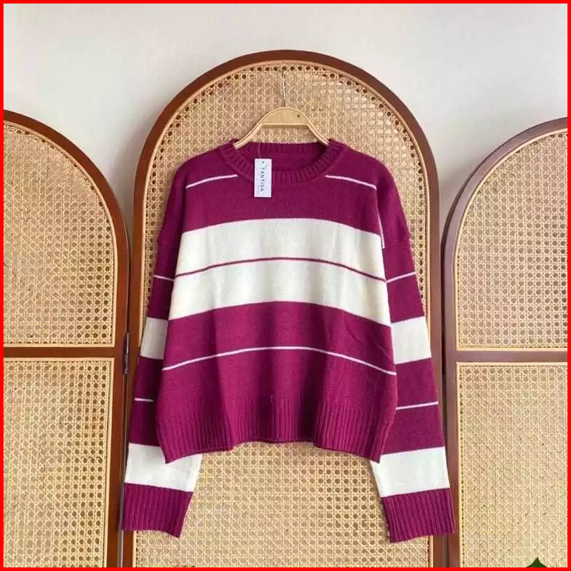 Sweater Rajut Crop Wanita Rinsyi Suji Motif Garis Lengan Panjang