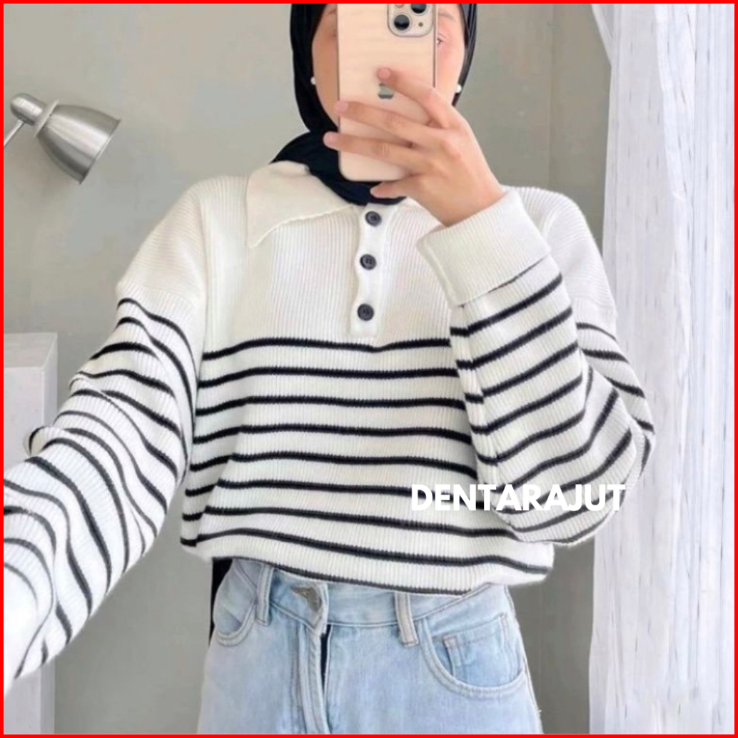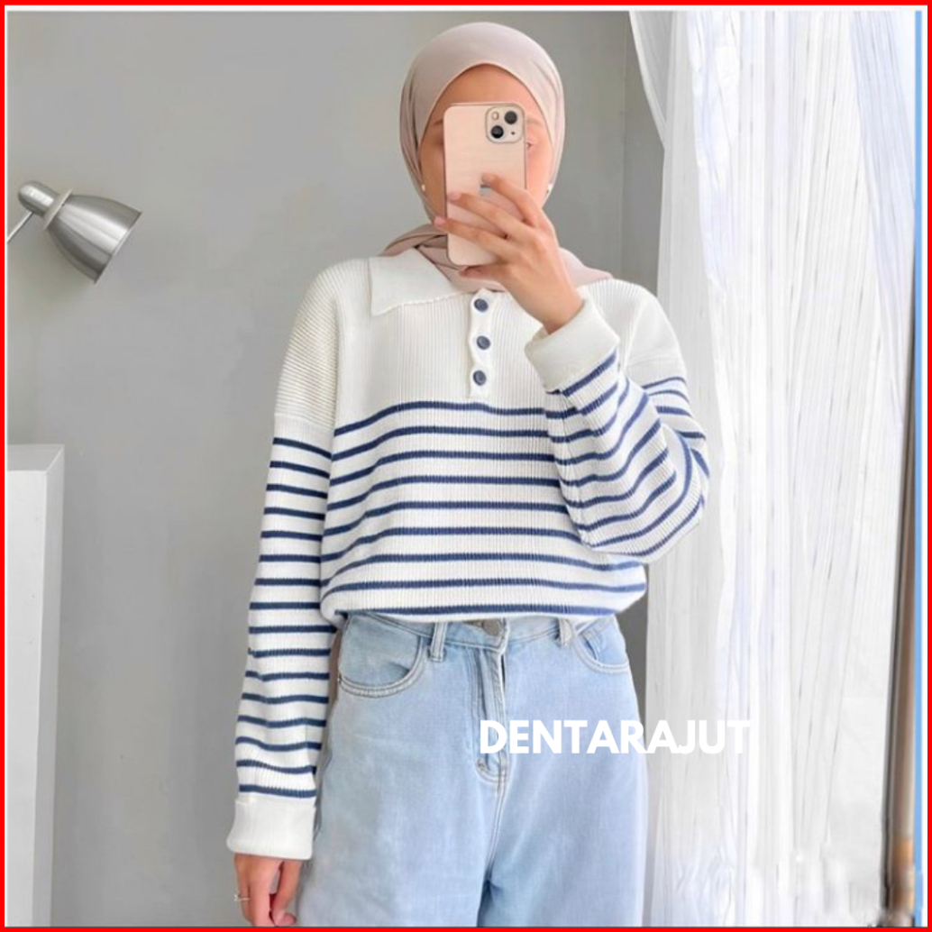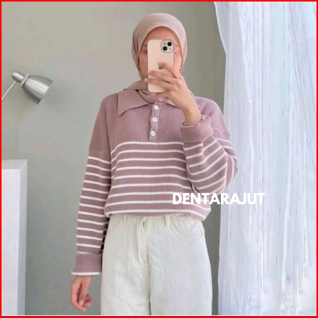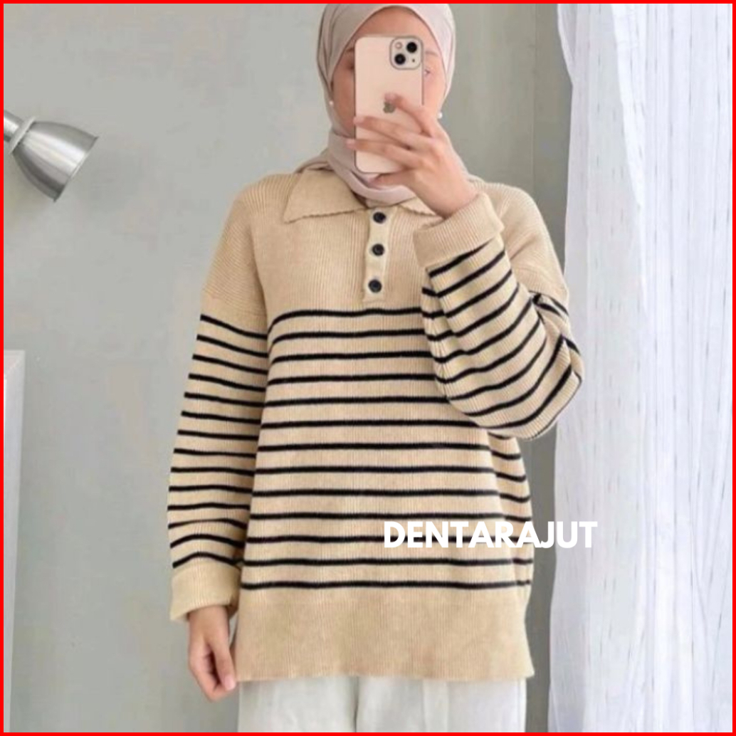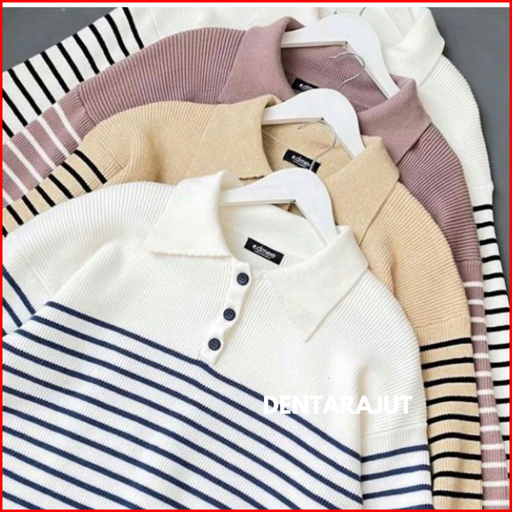 Devina Sweater Rajut Wanita Premium Polo Kancing Motif Garis